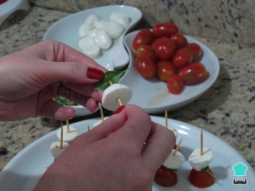 Monte os espetinhos a seu gosto, intercalando nos palitos tomates, folhas de manjericão e a mussarela de búfala cortada em cubinhos.