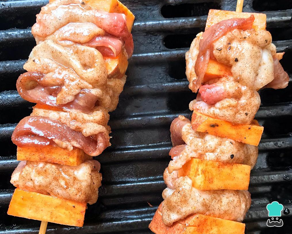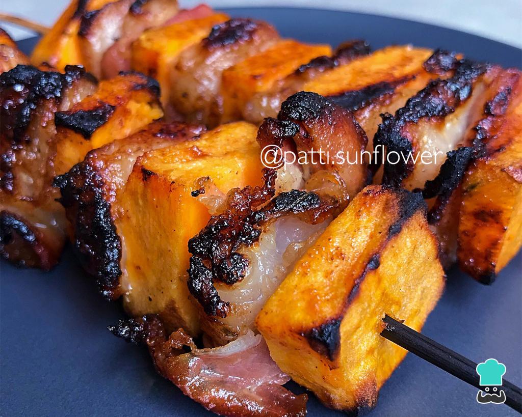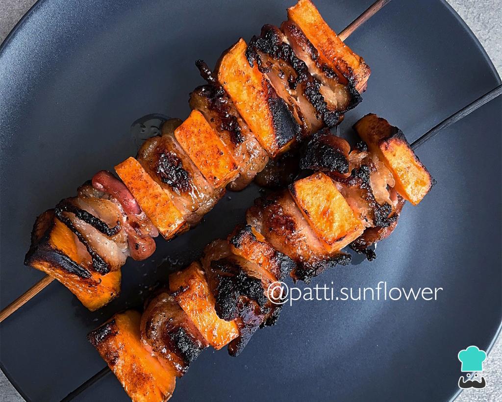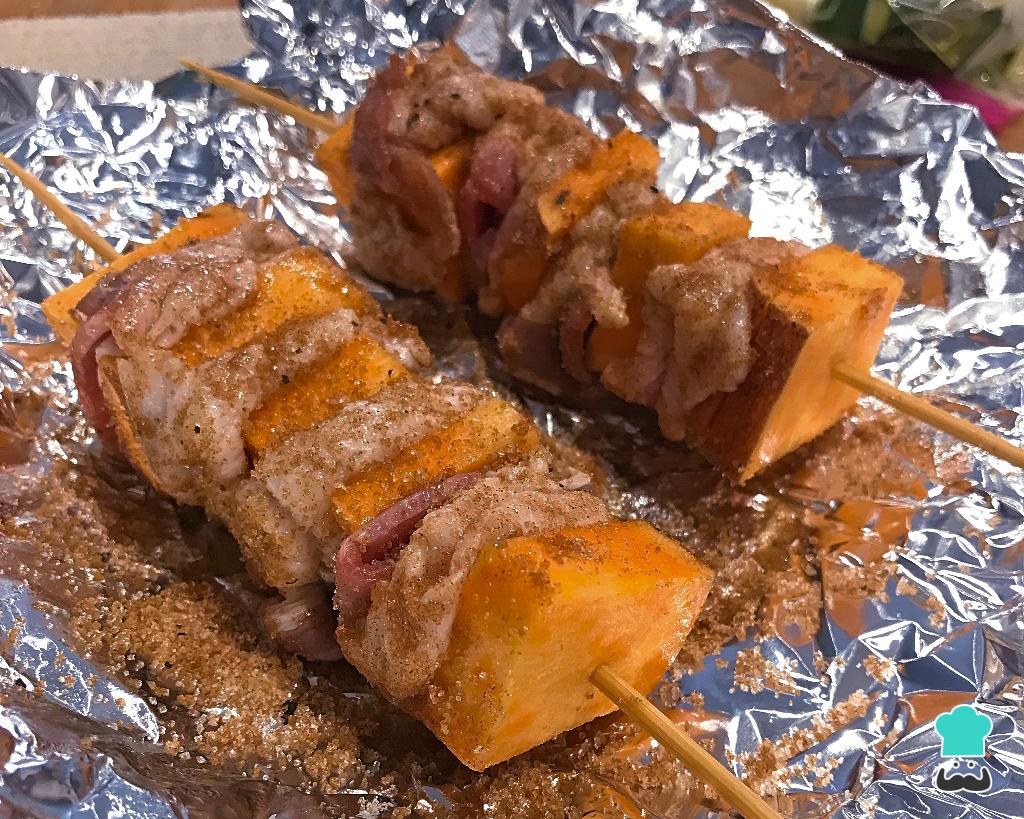 Esse espetinho é para surpreender todo mundo! A combinação do doce da batata doce com o salgado do bacon é de outro mundo! Aqui nos Estados Unidos é muito comum usar o bacon em preparações doces e eu, particularmente, acho fantástico.