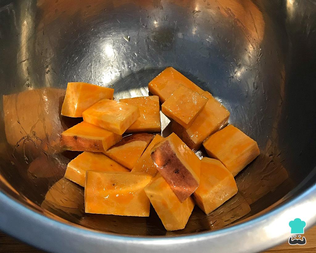 Corte a batata doce em quadradinhos e misture ela com o azeite.