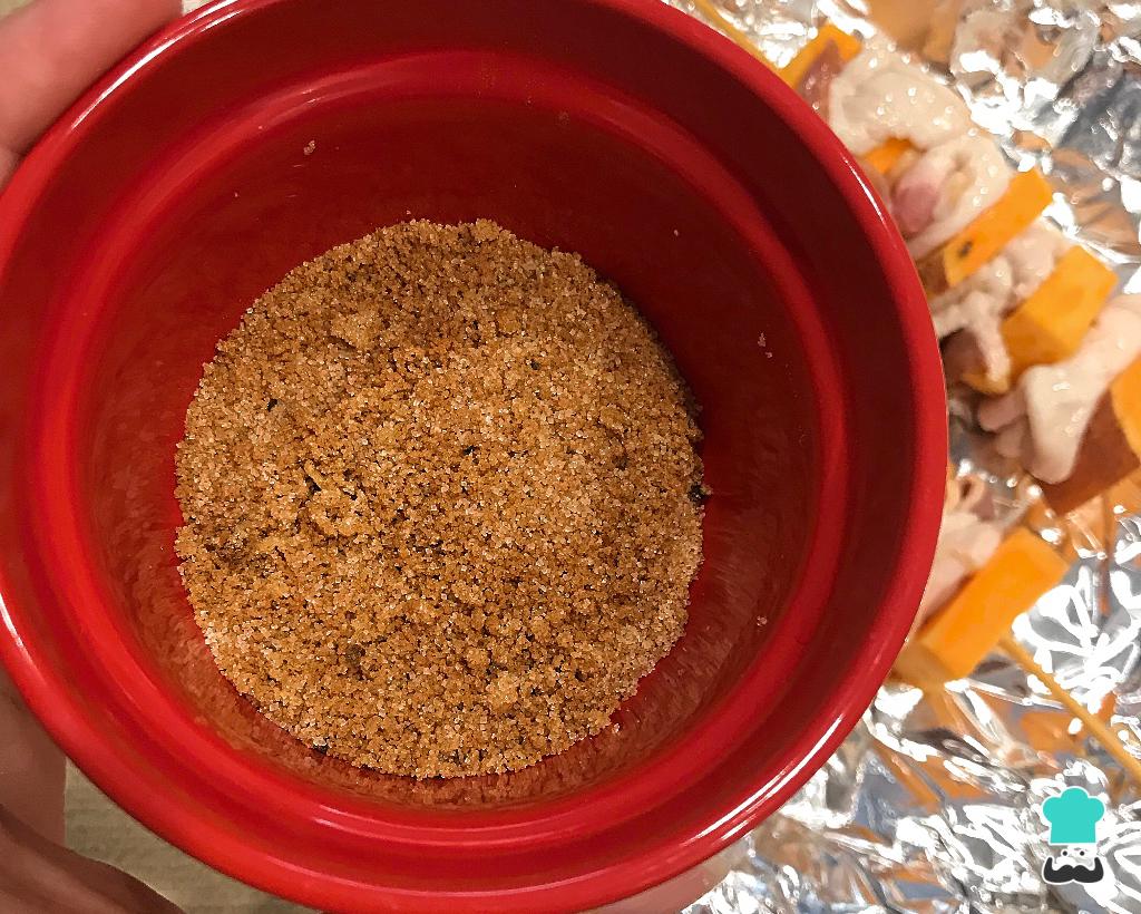 Misture os açúcares com o sal, a pimenta, a noz moscada e a canela. Essa combinação de temperos confere um gostinho caramelizado e aromático ótimo neste espetinho de batata e bacon!