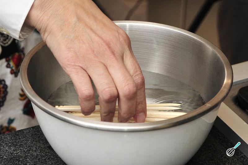 O primeiro passo para começar preparando estes espetinhos terra e mar é umedecer os palitos de espeto com água, assim será mais fácil colocar neles os ingredientes.