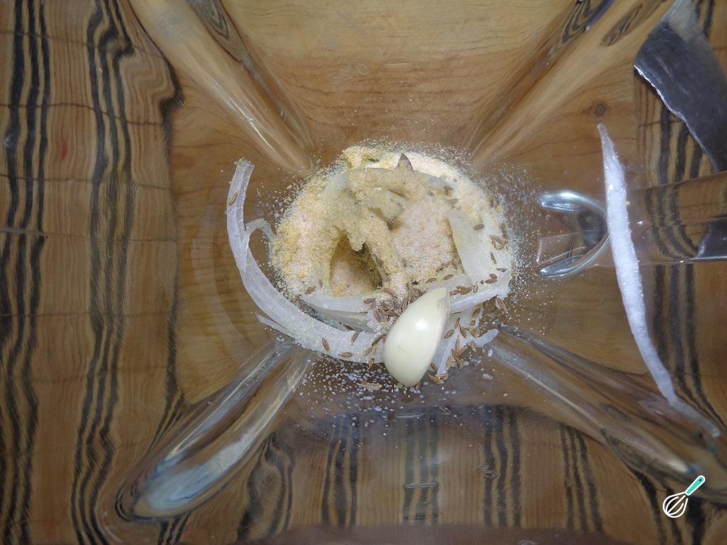 Comece por bater um pedaço de cebola, o dente de alho, uma pitada de sal, o cominho, o sal de alho e o leite no liquidificador. Bata bem até obter um molho homogêneo, transfira para uma tigela e reserve por um momento.