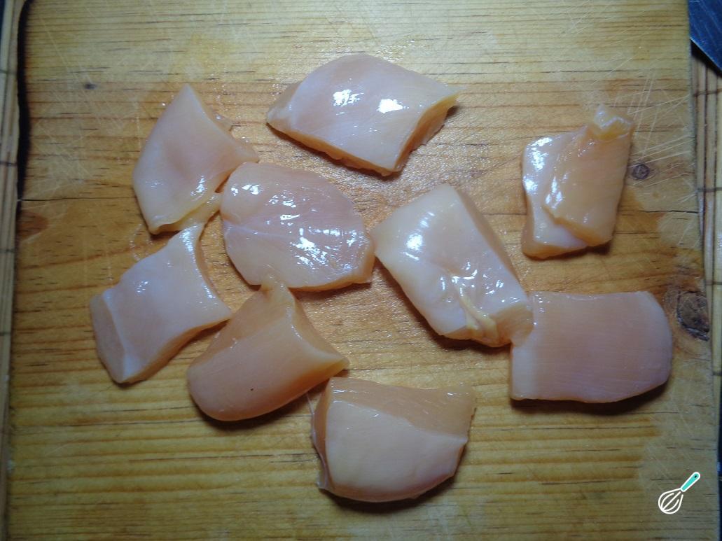 Corte os peitos de frango em pequenos cubos de aproximadamente 2 cm de cada lado. O ideal é seja possível comer cada pedaço de frango de uma vez, sem necessidade de usar talheres.