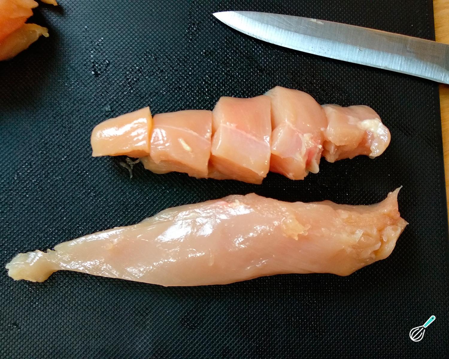 Comece esta receita de espetinhos de frango preparando a carne. Para isso corte os peitos de frango ao meio e depois em cubinhos de tamanho mais ou menos regular. Reserve os pedaços menores de carne para outras receitas.