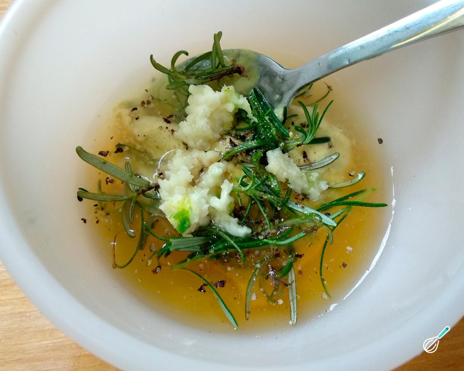 Numa tigela misture os temperos: a mostarda, o mel, o suco de limão, o alho, as folhinhas de alecrim e pimenta. Reserve o sal para temperar a carne apenas na hora de levar ao forno.