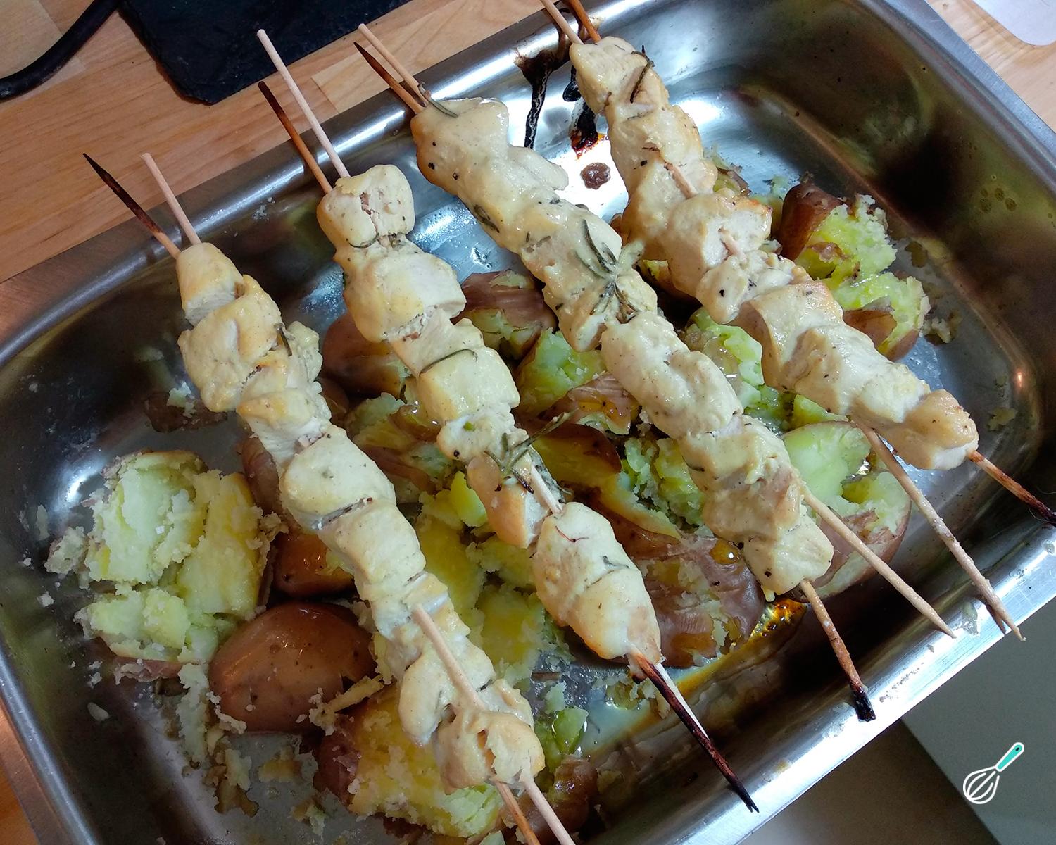 Depois desse tempo retire os espetinhos e pincele a carne com o molho que sobrou. Se você quiser pode aproveitar para, nesse momento, colocar o acompanhamento na assadeira - eu coloquei batatas ao murro. Leve ao forno por mais 5-10 minutos.