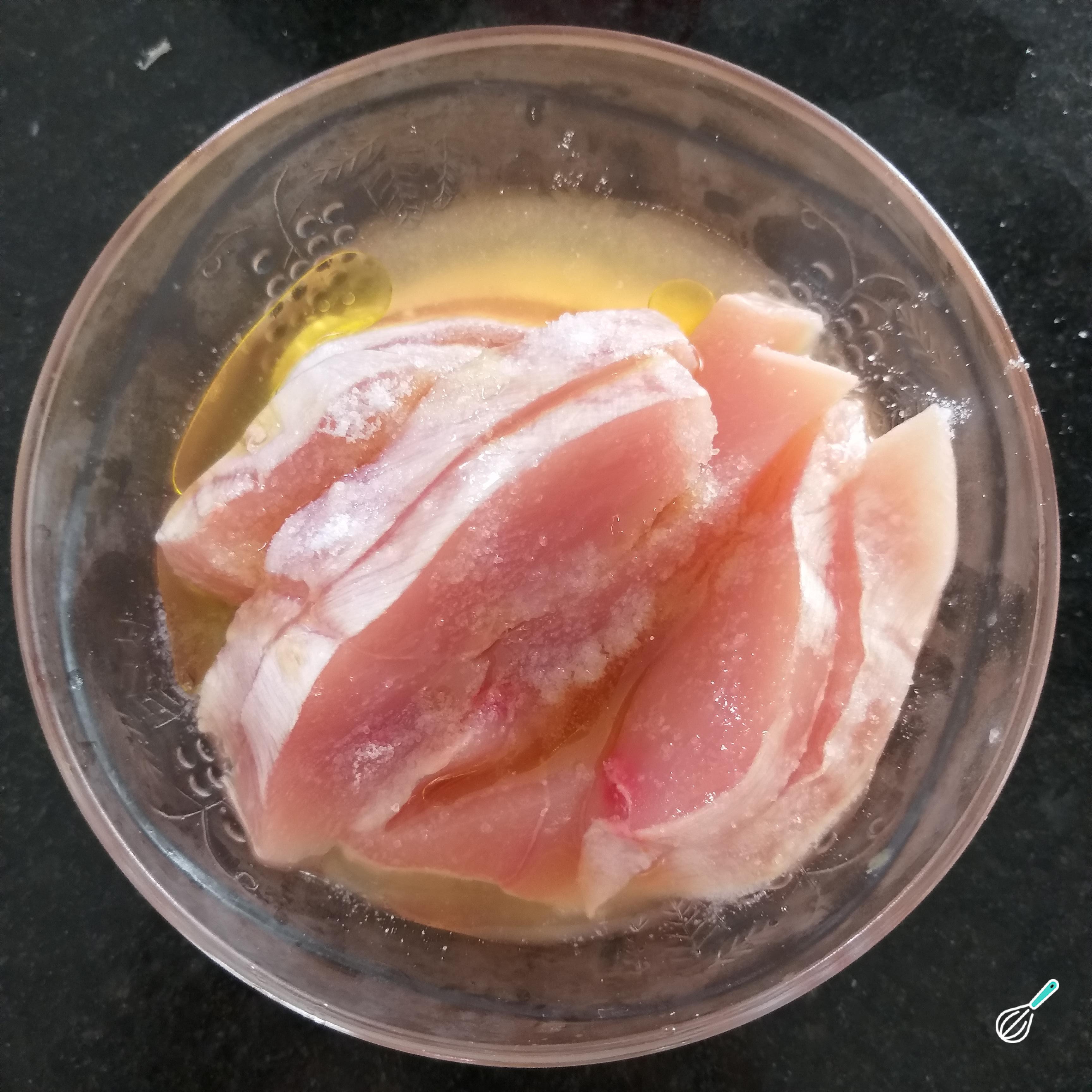 Corte o peito de frango em tiras e tempere com o alho, o sal, o azeite e o suco de limão. Deixe marinar por 5 minutos, para pegar o gosto.
