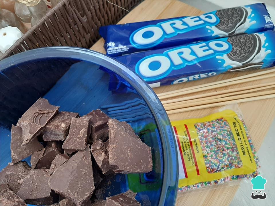 Primeiro separe os ingredientes e os itens necessários para a execução desta receita de pirulitos de Oreo.