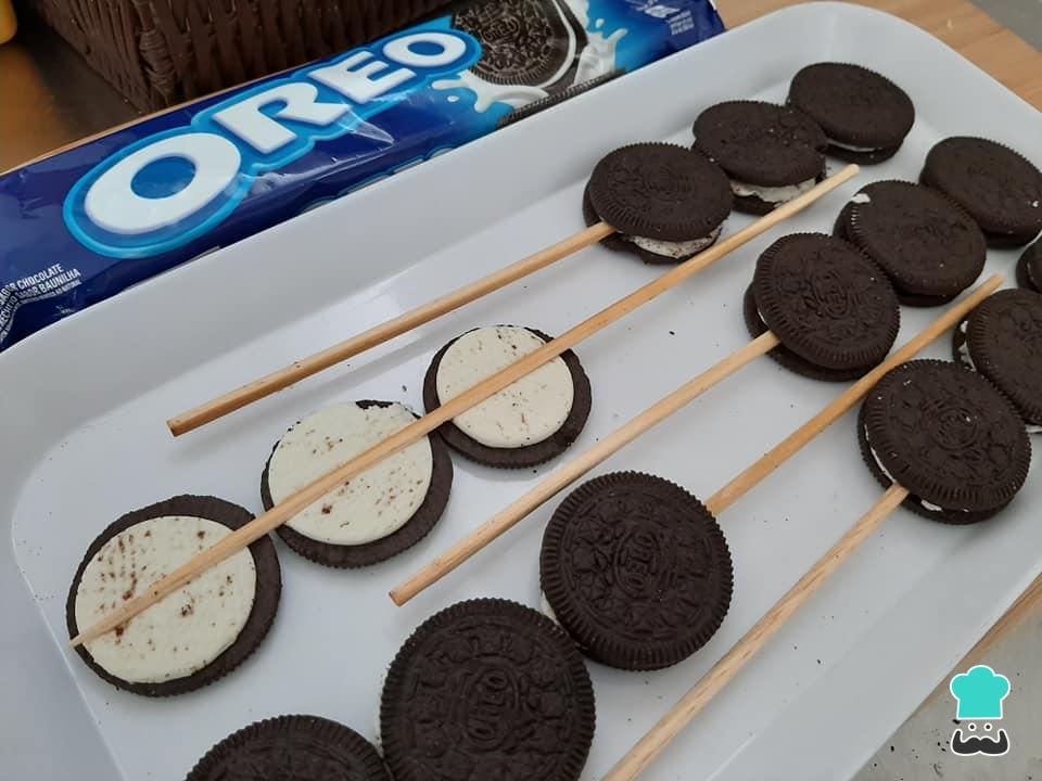 Abra os biscoitos, separando as bandas. Fixe os espetos de madeira ou os palitos de plástico no centro de 3 biscoitos enfileirados e una as outras partes, como na foto. Leve os espetos de biscoitos para o congelador e deixe por cerca de 1h30, para que fiquem mais firmes.