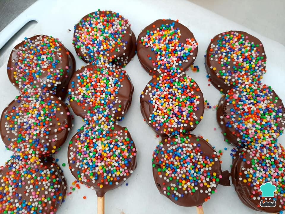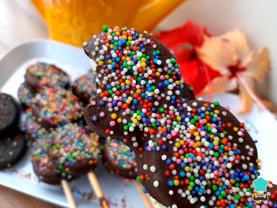 Agora, imagine um espetinho de biscoito Oreo, coberto com chocolate ao leite e decorado com miçangas coloridas! Além de lindos, são super saborosos e podem ser servidos gelados para fazer a festa da criançada no verão! Que tal?