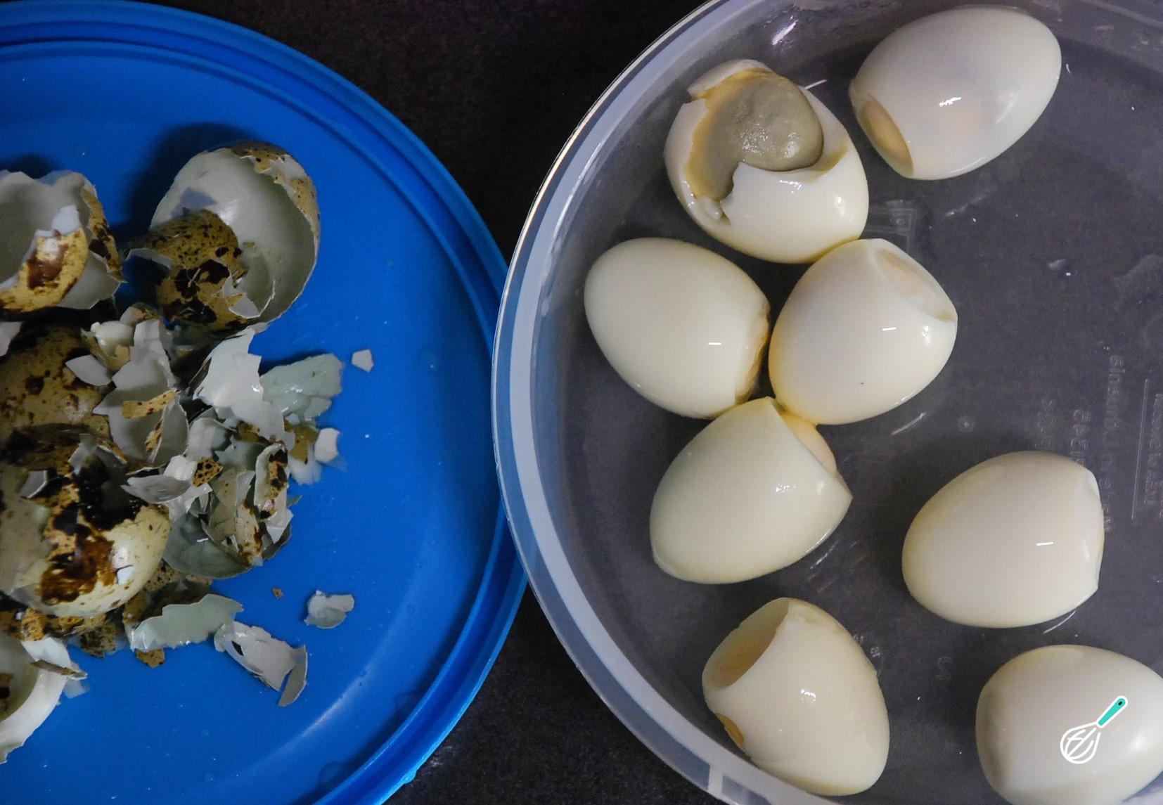 Em seguida descasque os ovos. Não se preocupe se, no momento de descascar, alguns ovos não ficarem inteiros, pois servirão igualmente para montar os espetinhos.