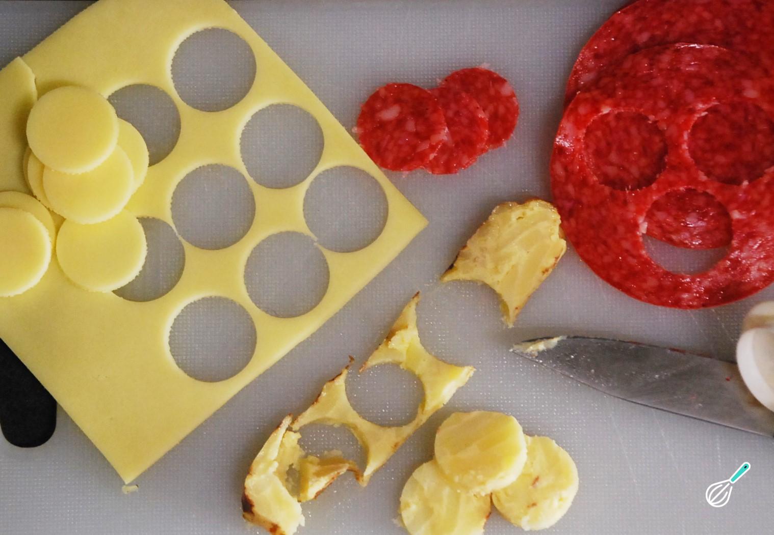 Em seguida corte em rodelas os restantes ingredientes: o queijo, o salame e outro a seu gosto, como presunto, azeitona, bacon, etc.
