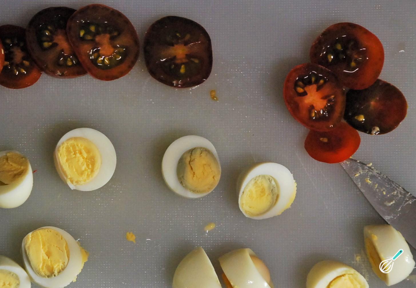Corte cada ovinho em duas metades e os tomates em rodelas também - deve obter cerca de 3-4 rodelas de cada tomate.