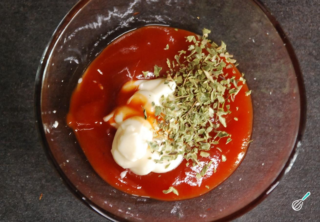 Para conferir mais sabor a estes deliciosos espetinhos prepare um molho simples misturando molho ketchup com maionese, molho ardido e oréganos a gosto. Misture muito bem.