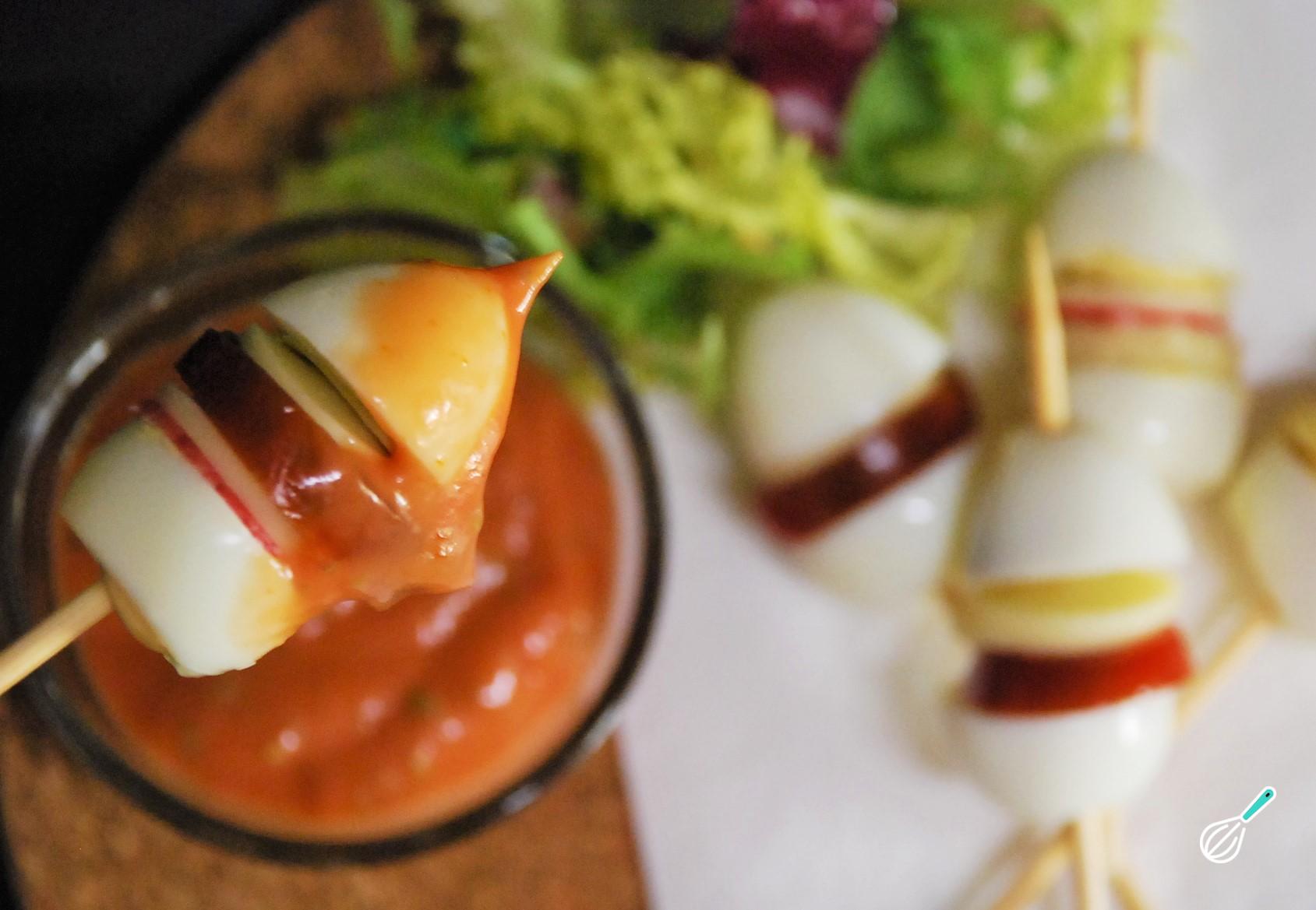 Receita de Espetinho de ovo de codorna com tomate cereja