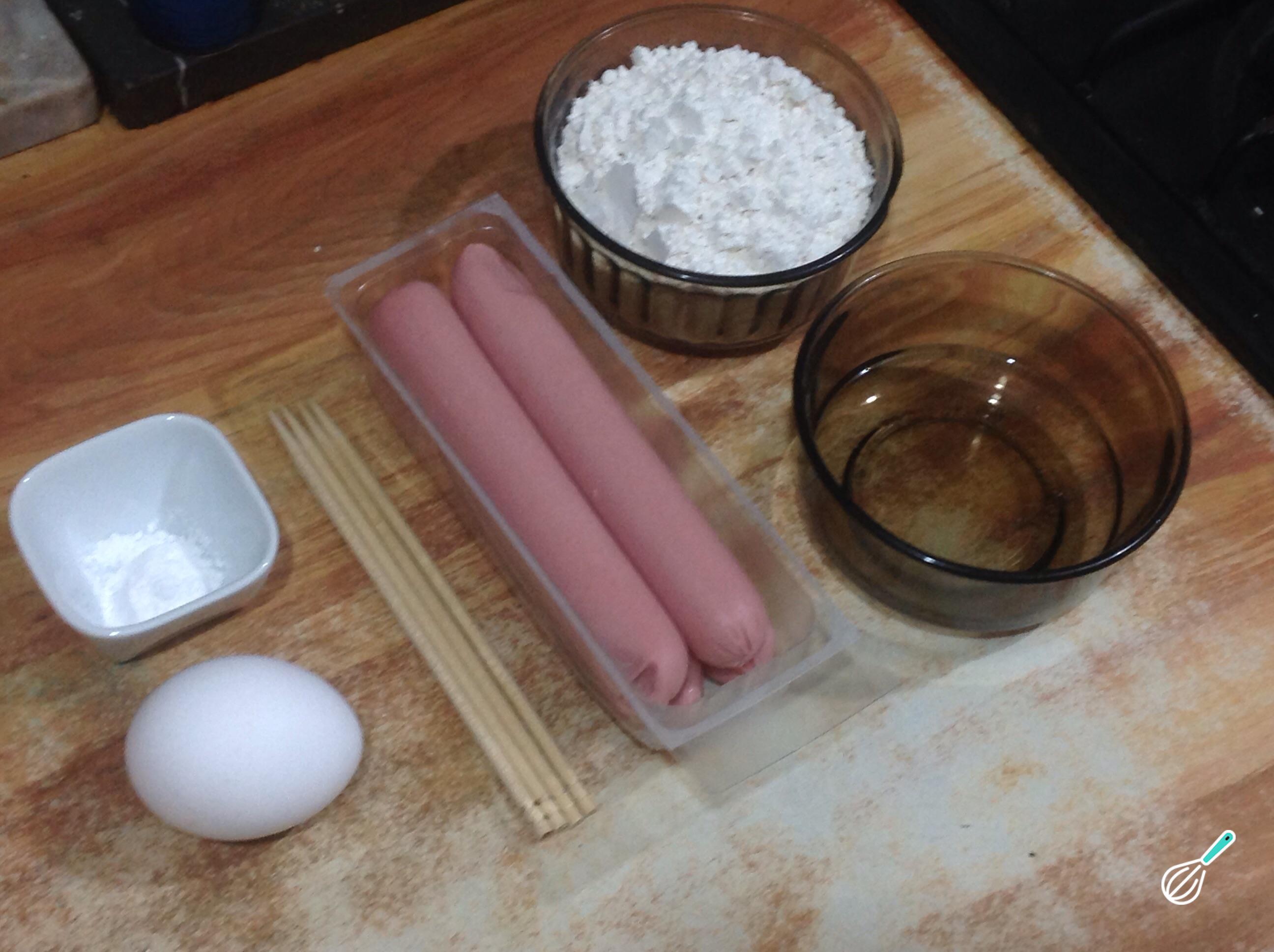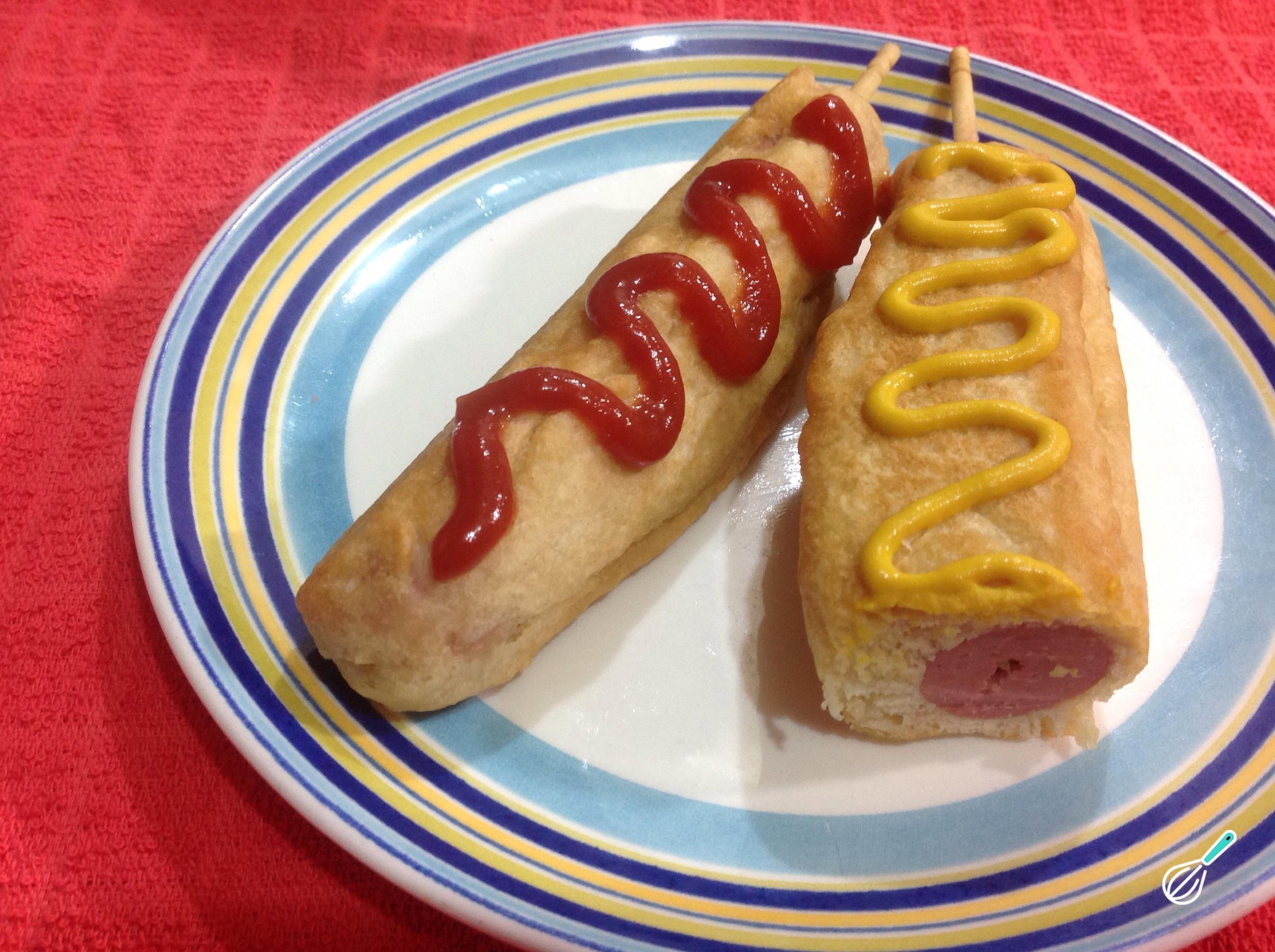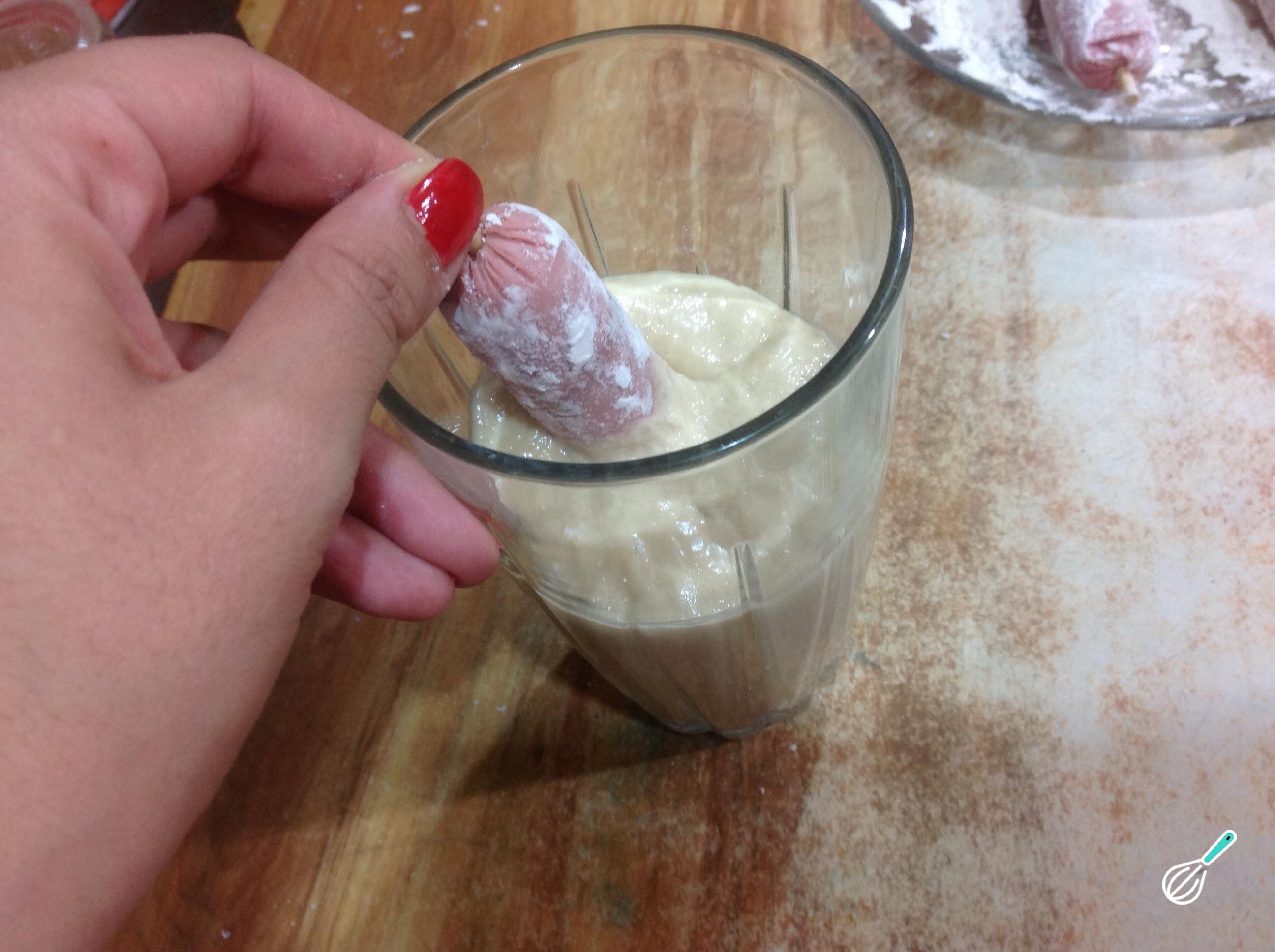 Pegue a extremidade do espeto e mergulhe as salsichas na massa até ficarem bem cobertas. Para cobri-las mais facilmente, encha um copo com a massa e mergulhe as salsichas dentro do copo.