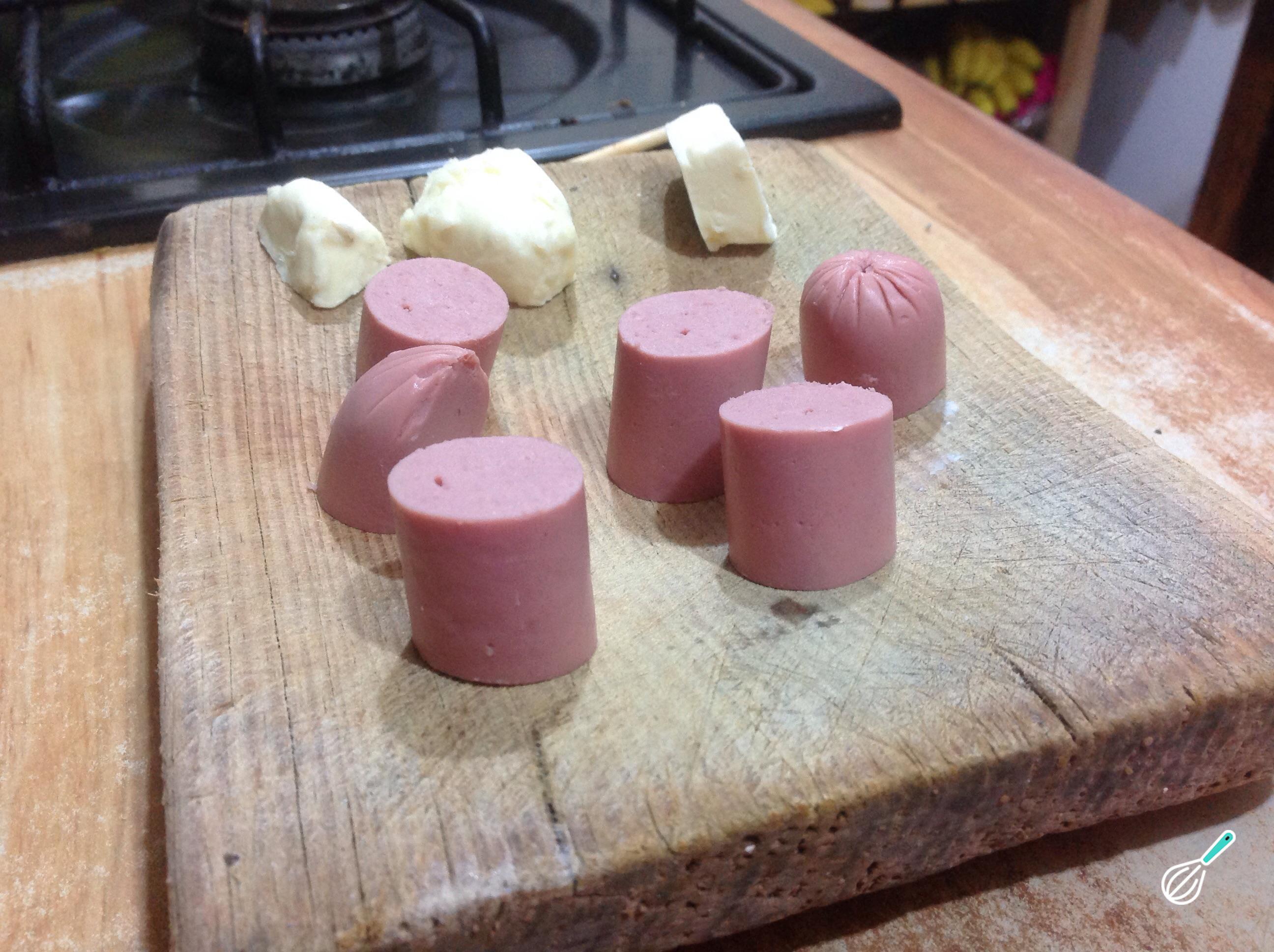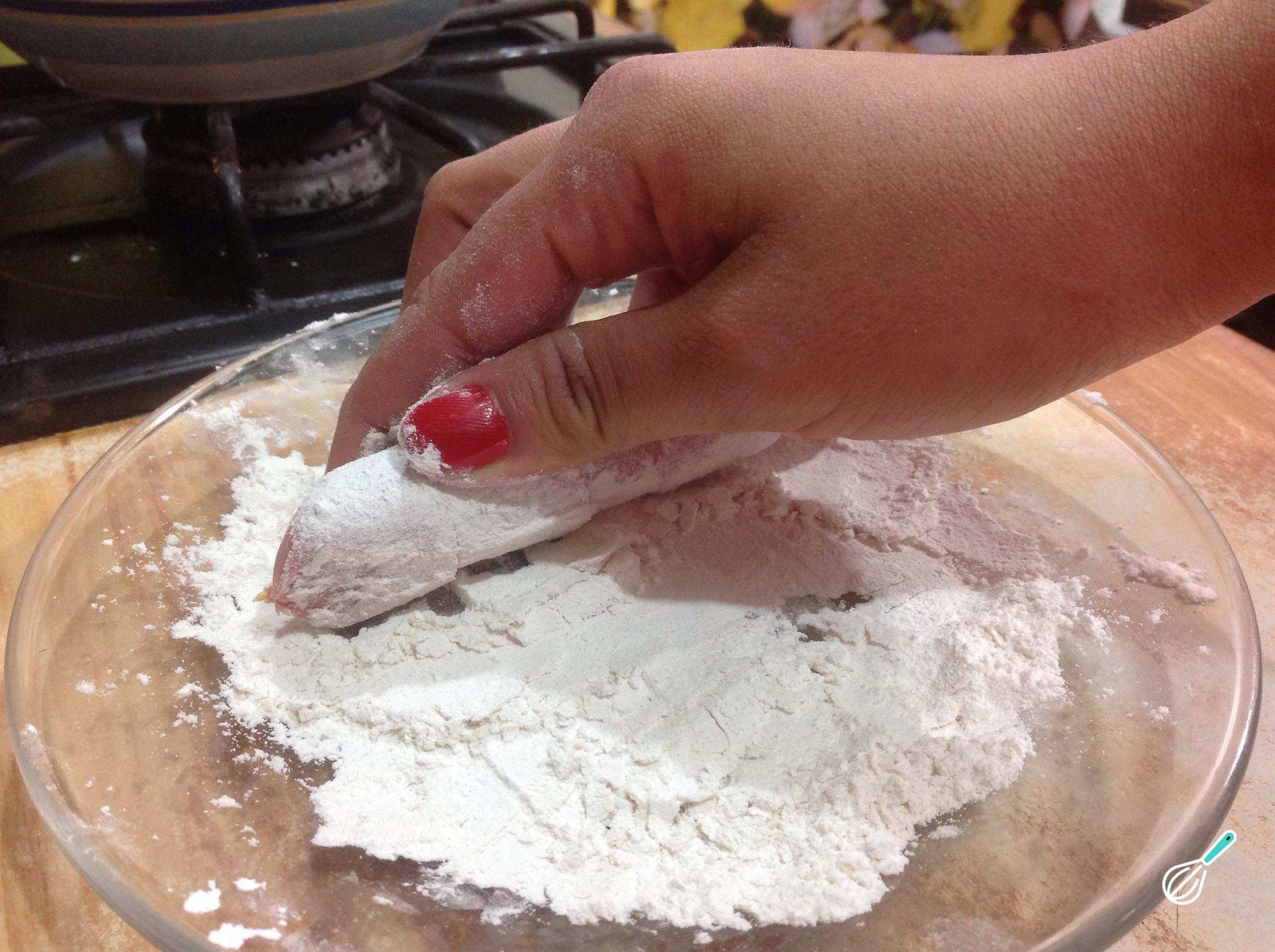 Empane cada salsicha com farinha para fazer a massa aderir melhor.