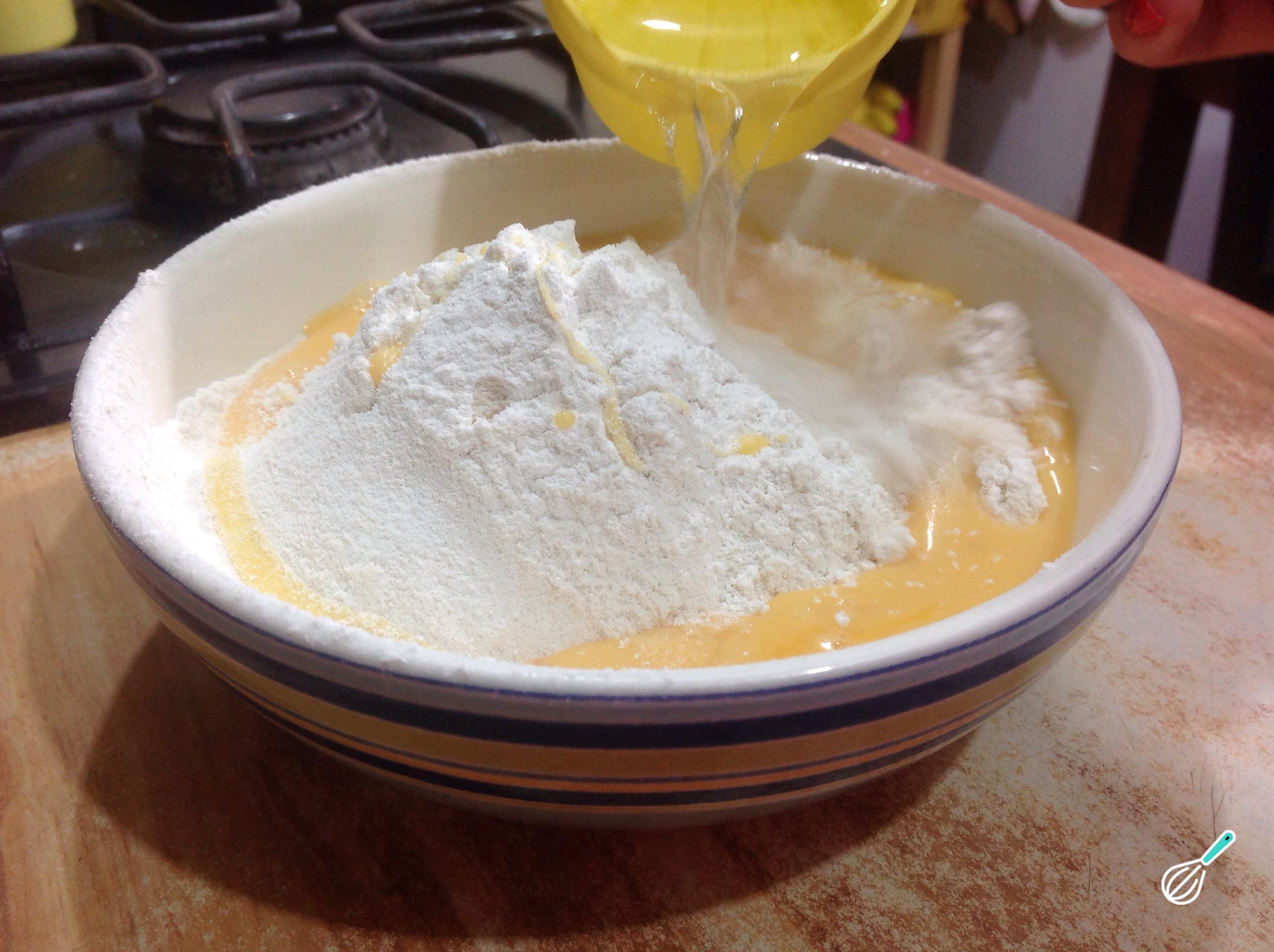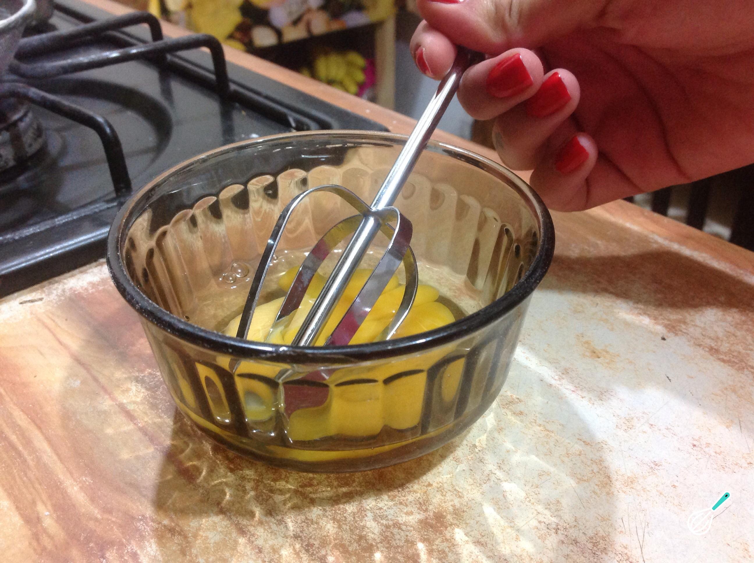 Adiciona o ovo batido e a água mineral e misture até obter uma mistura grossa.