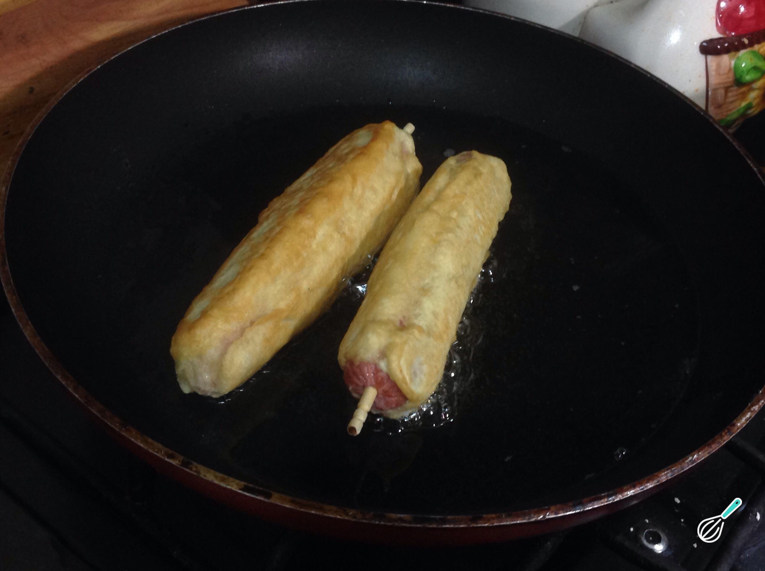 Frite os espetinhos aos pares em uma panela com óleo quente. Cuidadosamente mergulhe-os em óleo para evitar salpicos, o óleo quente pode queimar a pele. Deixe fritar por cerca de 3 minutos, até dourar.