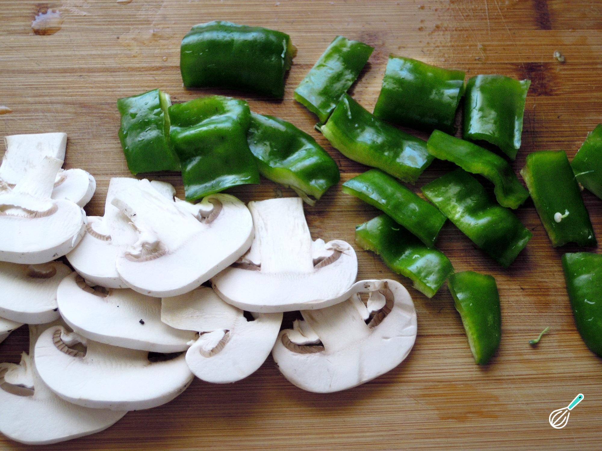Se os cogumelos estiverem inteiros, corte em fatias grossas e corte o pimentão verde em bocados.
