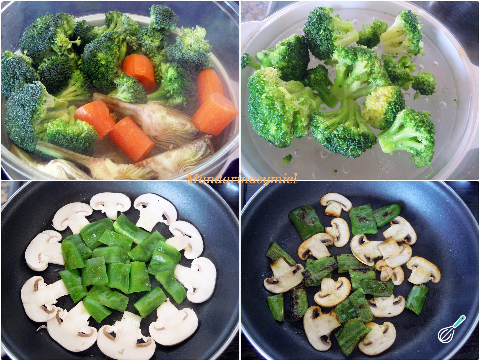 Coza as verduras em vapor ou leve-as a ferver (os brócolis, a vagem e a cenoura).