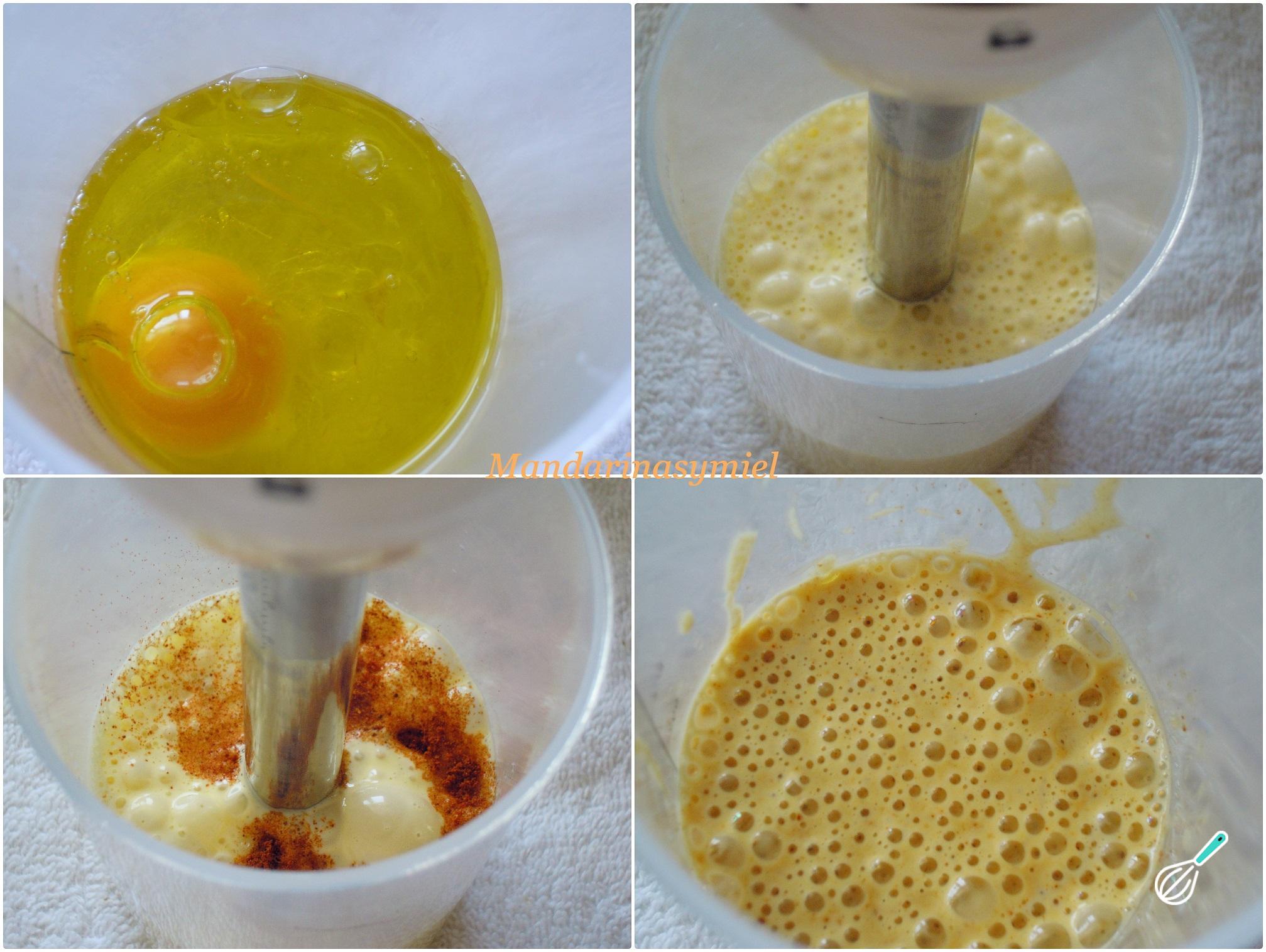 Enquanto os vegetais cozinham, comece a preparar a maionese de pimentão. Coloque o ovo em uma taça, cubra de azeite e bata até que fique bem misturado. Adicione o pimentão em pó e continue a bater.