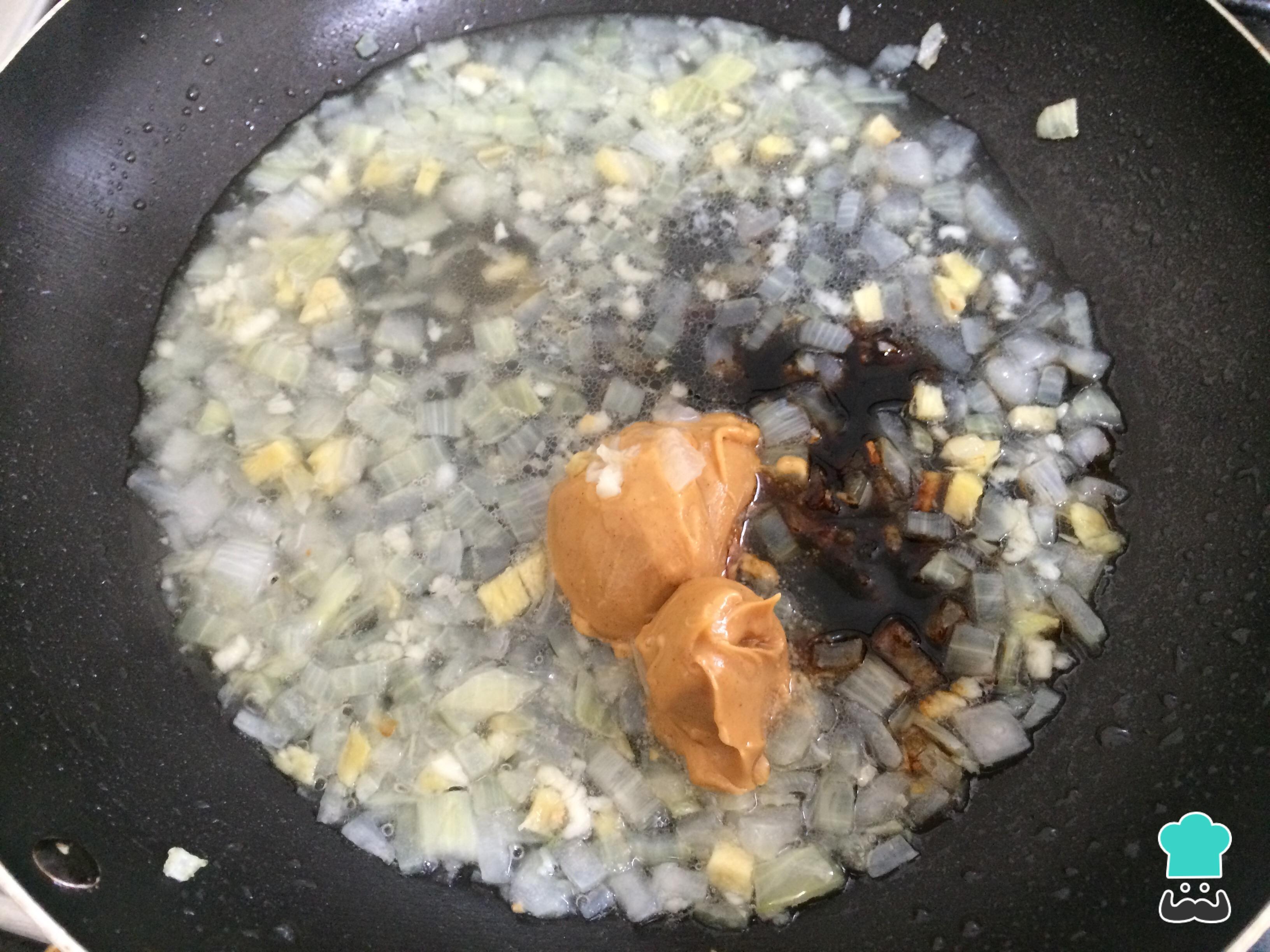 Após o passo anterior, adicione um pouco de água e o suco de limão. Deixe cozinhar por mais 1 minuto e, depois, junte a manteiga de amendoim e o shoyu e misture bem.