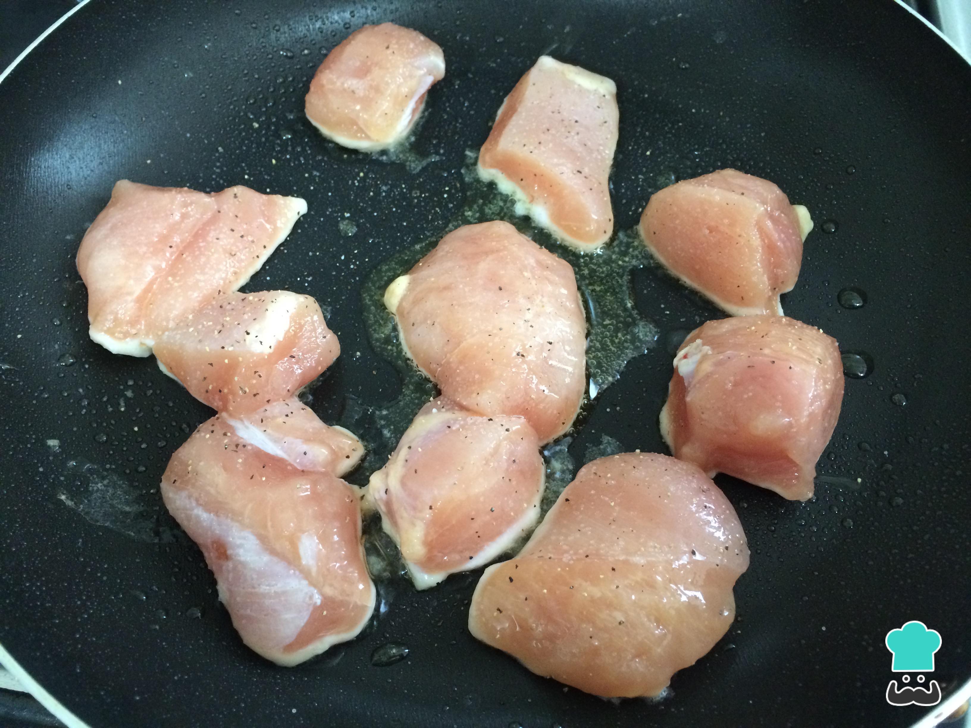 Antes de fazer esta receita de frango, comece por preparar os ingredientes: corte o peito de frango em cubos e pique a cebola.