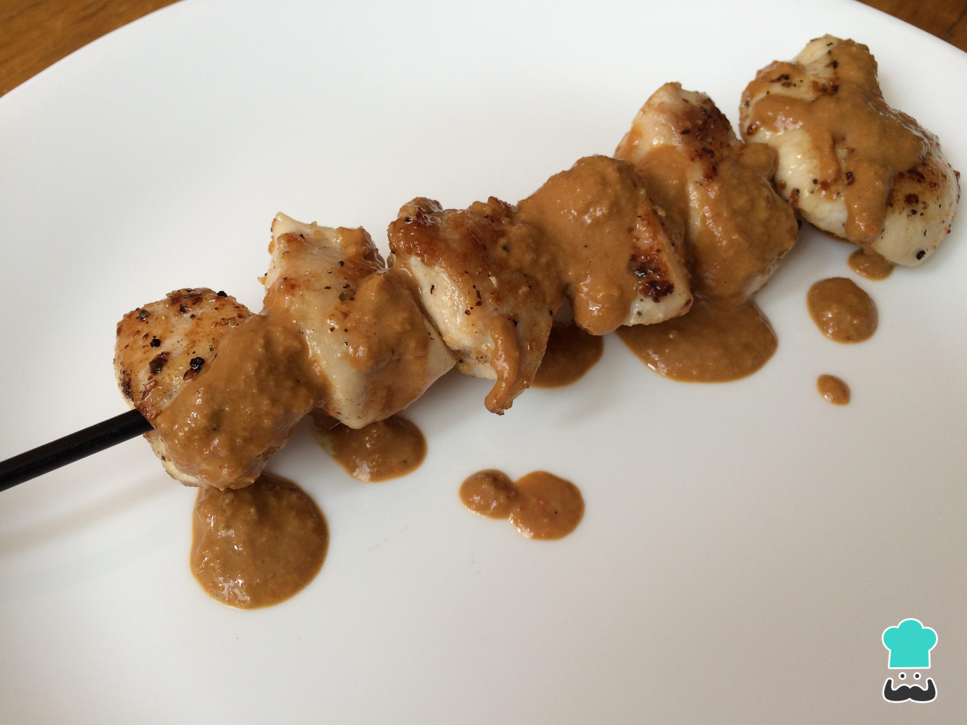 Para terminar esta receita de espetinhos de frango satay, coloque os cubos de carne em um palito de espeto, cubra com o molho, e está pronto a servir! Acompanhe com, por exemplo, purê de couve-flor gratinado, e bom apetite!