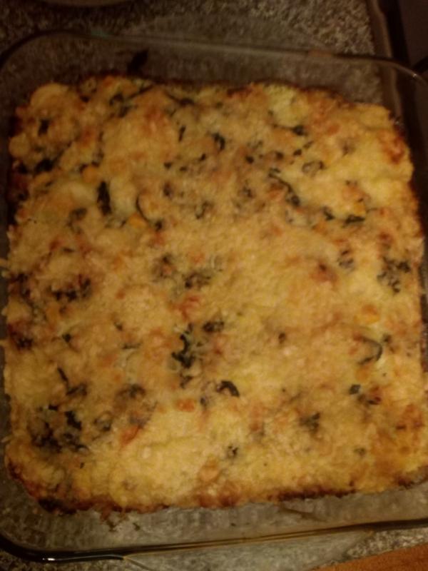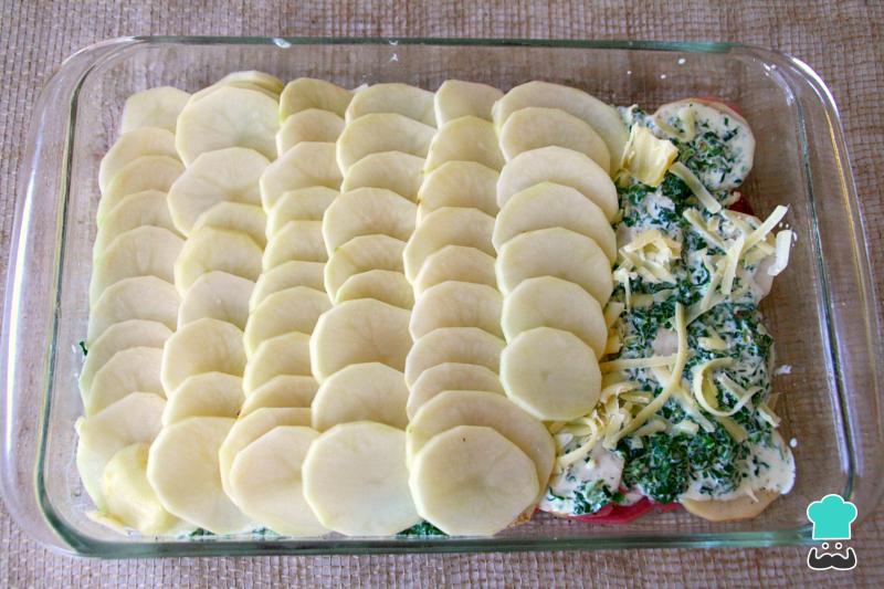 Unte um refratário com um pouco de margarina. Espalhe uma camada de batata e cubra com metade da mistura de espinafre. Polvilhe com queijo mussarela e repita esta operação, terminando com o queijo. Asse no forno de microondas por 10 minutos, em potência alta.