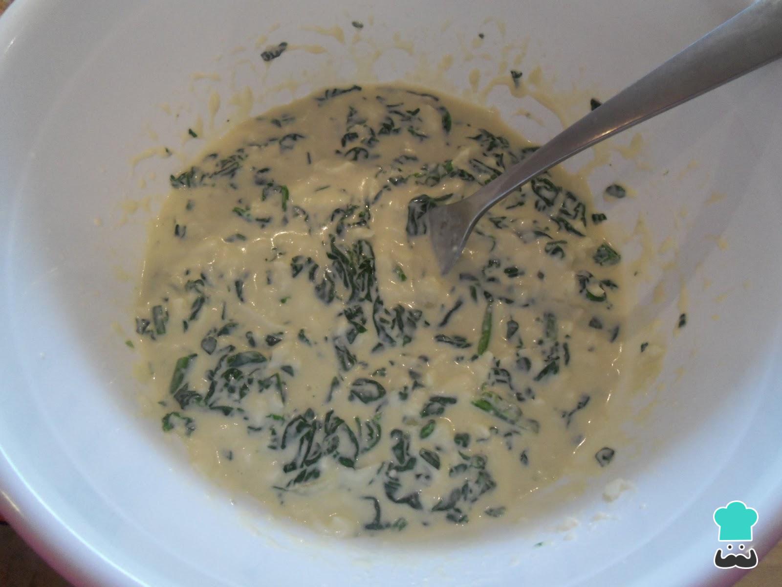 Coloque o creme de leite, a maionese, o presunto, o sal e o espinafre em uma tigela. Misture tudo muito bem.