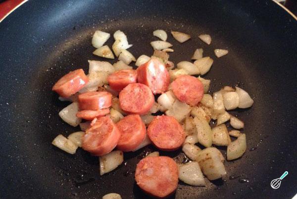 Junte a linguiça calabresa, a cenoura e deixe refogar até a cenoura ficar macia.
