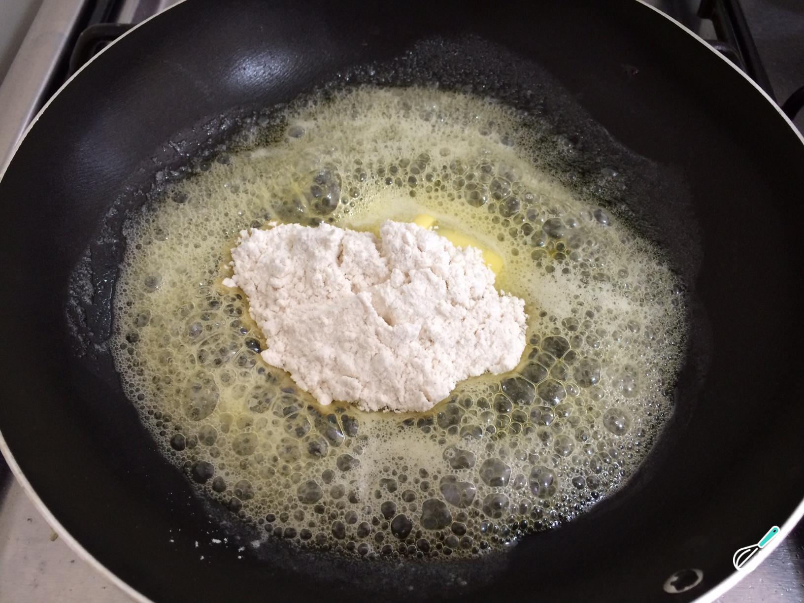 Para fazer o molho branco, em uma frigideira derreta a manteiga, adicione a farinha, misture com um batedor de mão e cozinhe por alguns minutos, para eliminar o gosto de farinha crua.