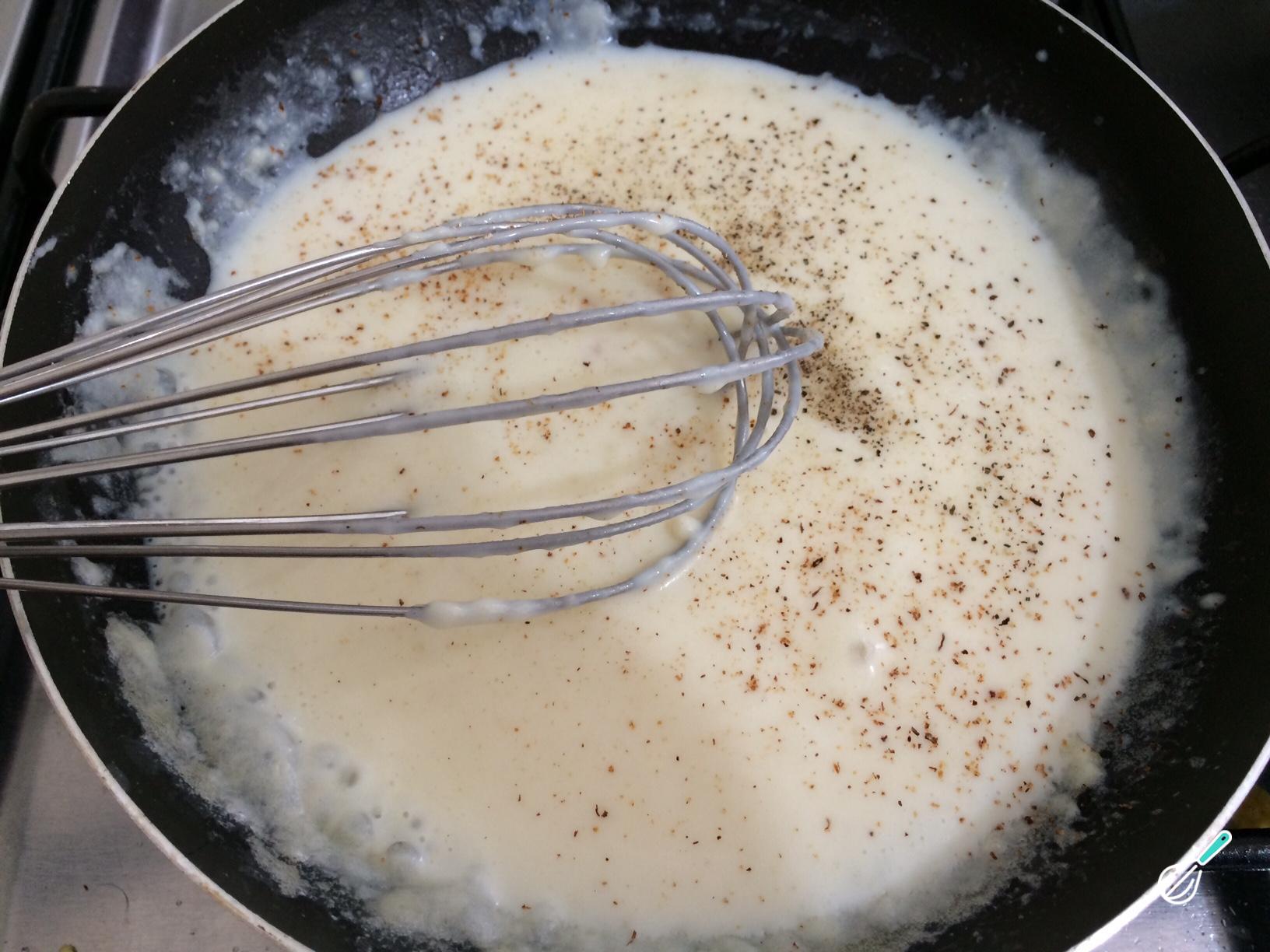 Adicione o leite a ferver,pouco um pouco, e vá misturando com o batedor até obter um molho espesso e sem grumos. Finalmente, adicione a pitada de noz-moscada, sal e pimenta.