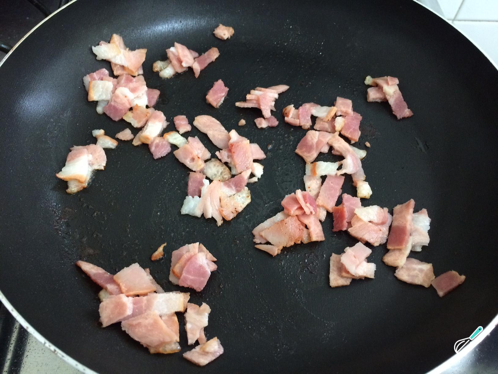 Separadamente, em uma frigideira antiaderente, frite o bacon em fogo médio cortado fino, até que ele solte a sua própria gordura e fique dourado e crocante. Mexa constantemente para evitar que se queime.