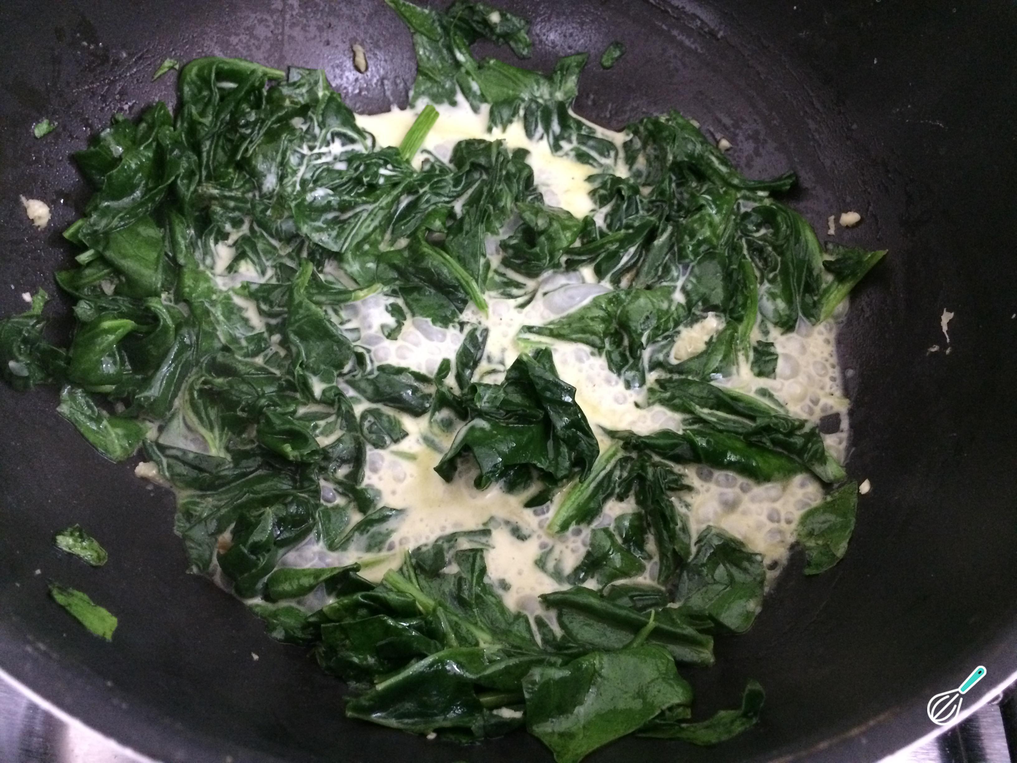 Pegue o espinafre e o creme de leite e acrescente nessa mistura que está na panela, mexa bem e desligue o fogo antes de ferver. Seu espinafre cremoso está prestes a ser servido.