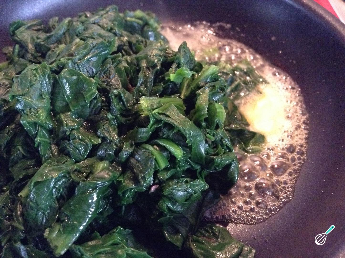 Leve uma frigideira ao fogo médio e adicione um pouco de manteiga. Uma vez derretida, adicione o espinafre cozido.