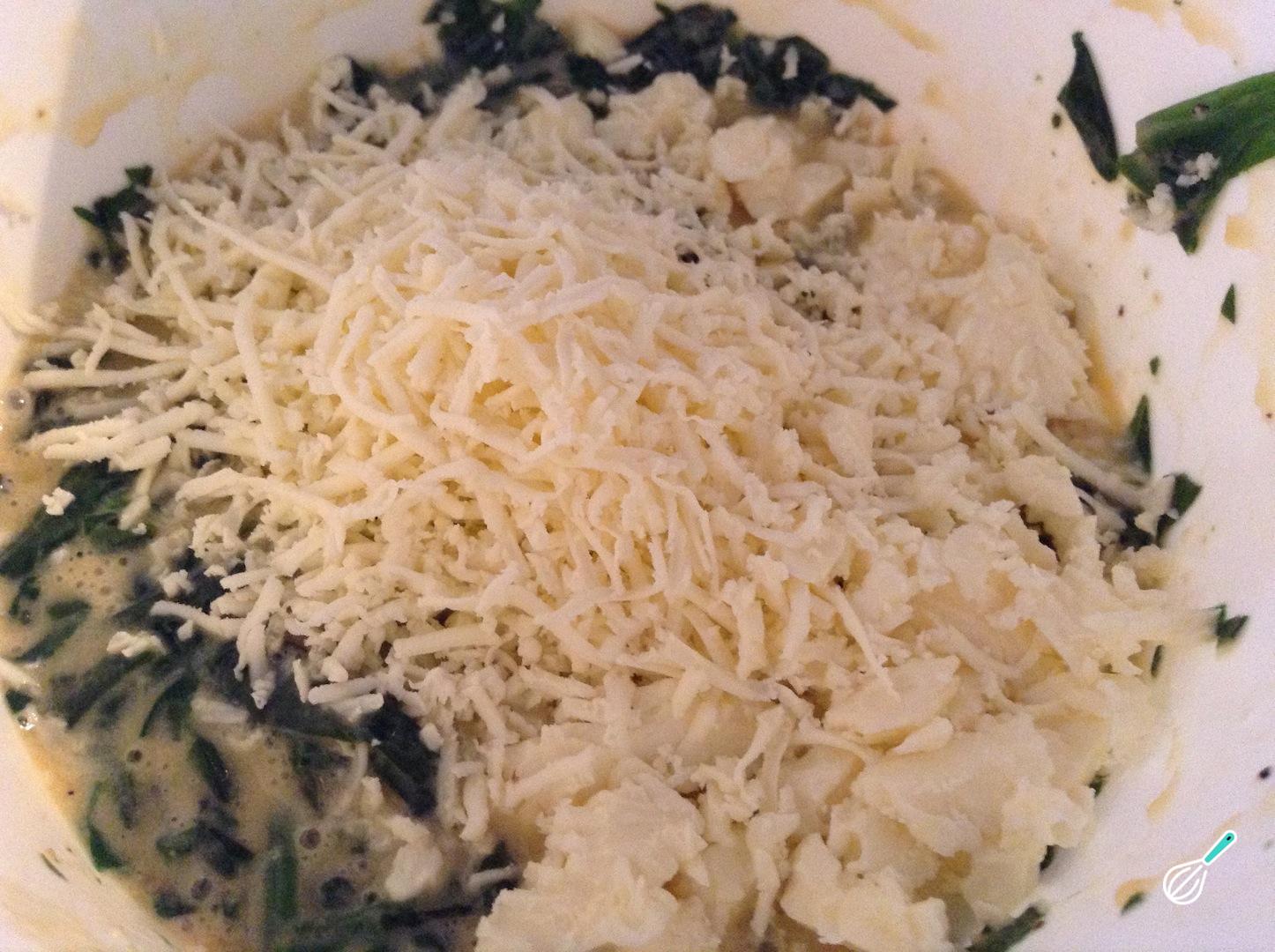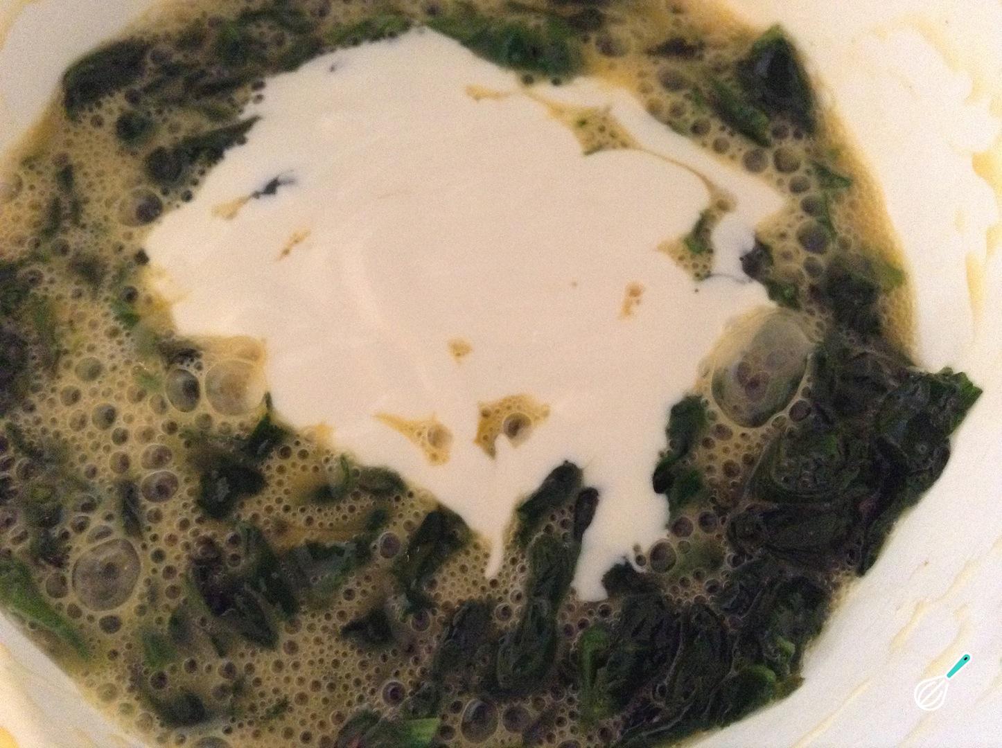 Coloque o espinafre em uma tigela e, quando estiver frio, adicione os ovos. Misture estes ingredientes até se integrarem bem.