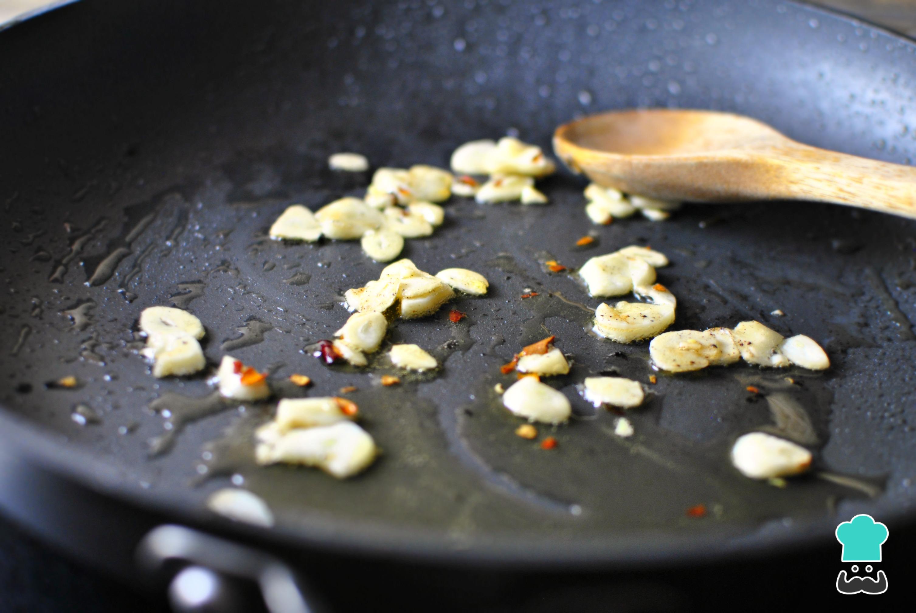 Descasque e corte os dentes em fatias finas e use um pilão para esmagar as pimentas. Coloque o azeite e o alho juntos em uma frigideira e refogue em fogo médio, garantindo que frita dos dois lados, até dourar. Desligue o fogo, junte a pimenta e reserve.