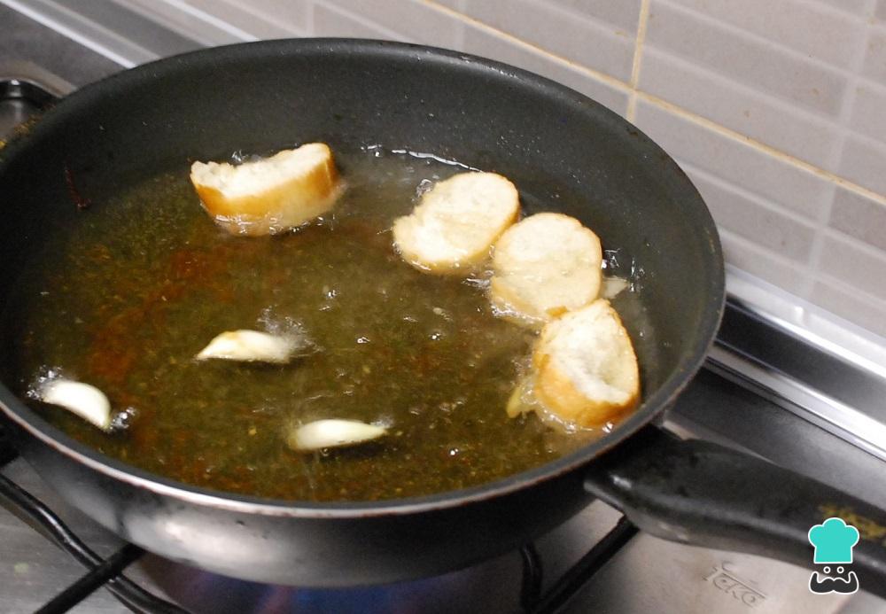 Numa frigideira à parte com azeite ou óleo abundante frite as fatias de pão com os dentes de alho até dourar bem. Retire o pão e os alhos para um prato com papel absorvente.