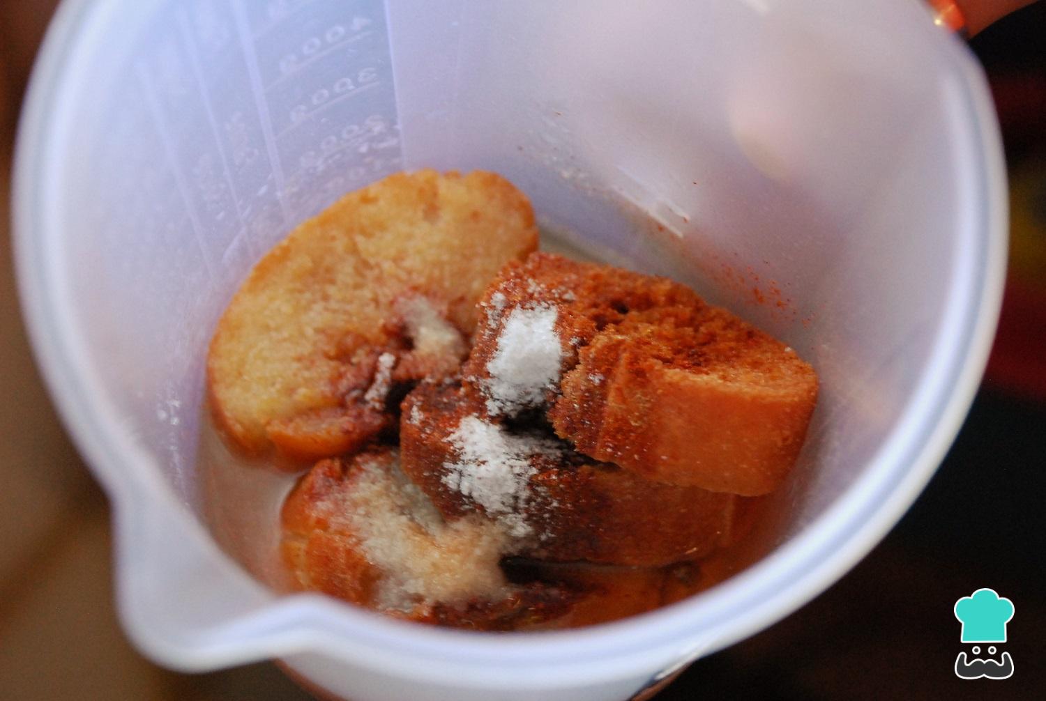 Bata no liquidificador ou com um mixer de pão as fatias de pão, os alhos, as especiarias, o tablete de caldo e água até obter uma mistura homogênea e líquida.