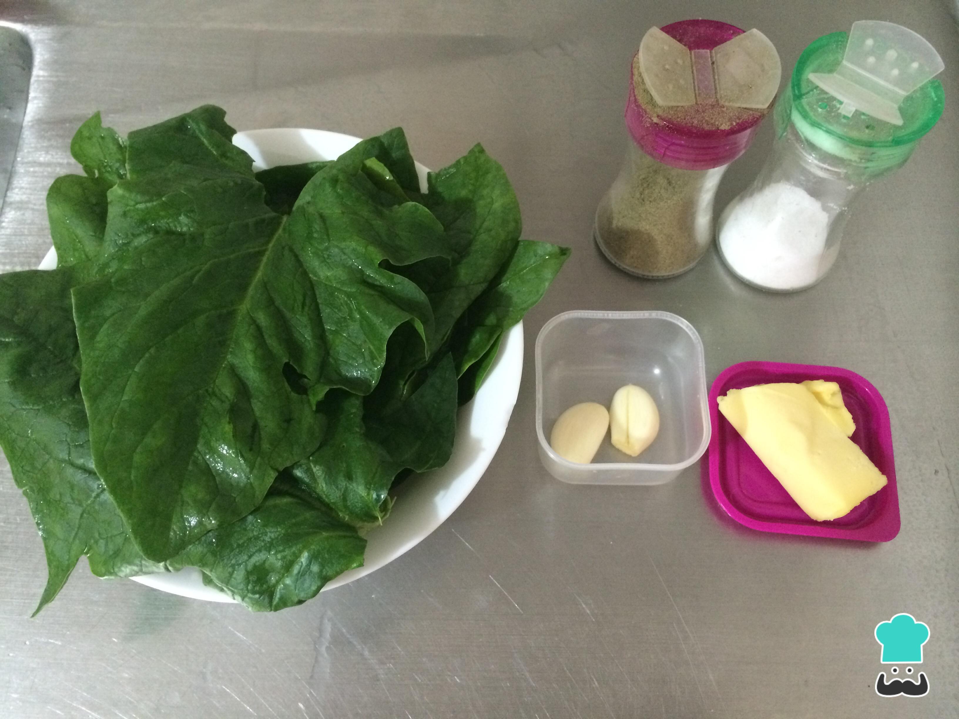 Para preparar esta receita de espinafres salteados com alho comece por reunir todos os ingredientes.