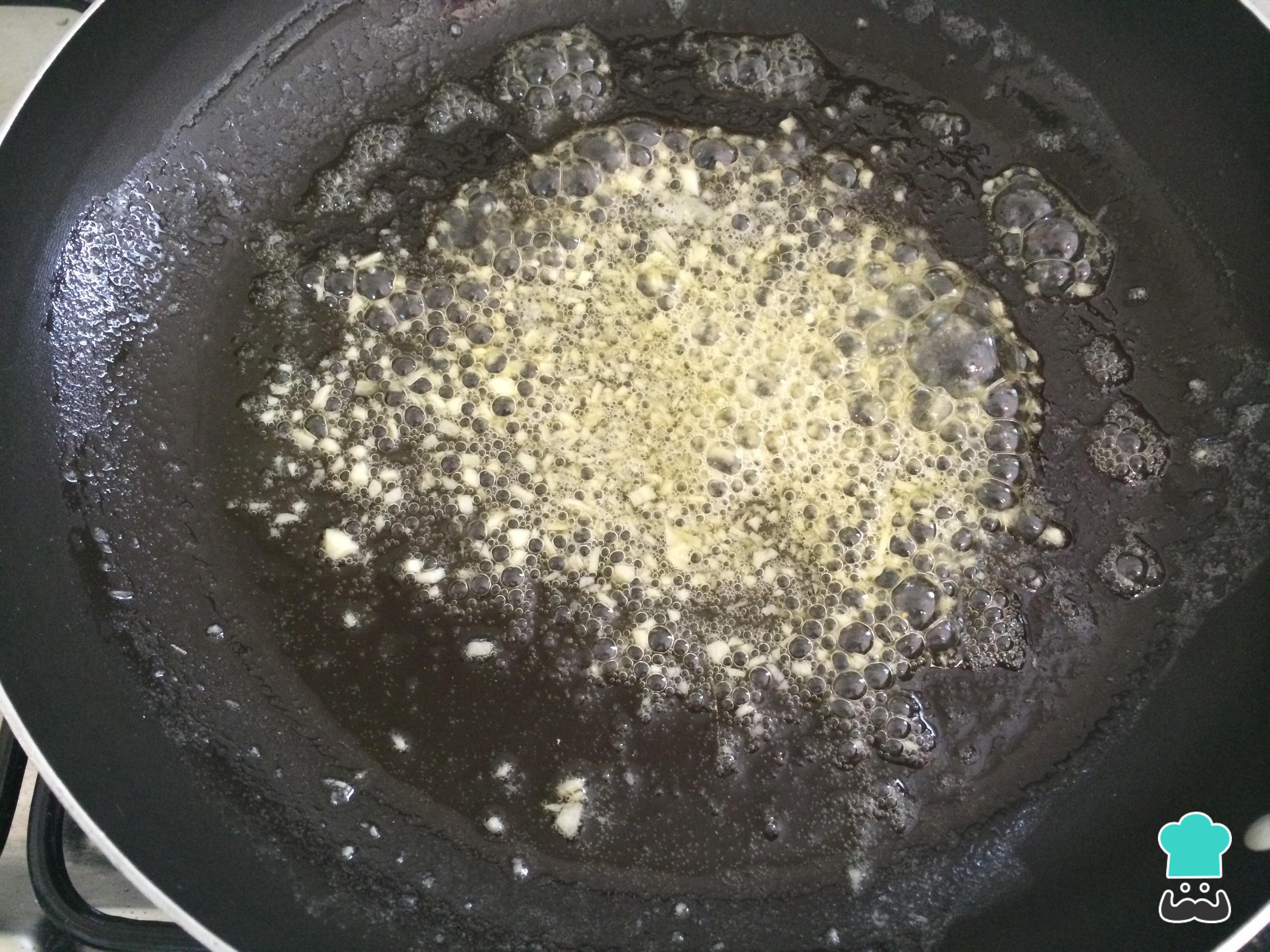 Descasque e pique o alho muito finamente. Leve ao fogo médio uma frigideira com a manteiga e, assim que estiver derretida, adicione o alho e cozinhe durante 3 minutos, mexendo sempre.