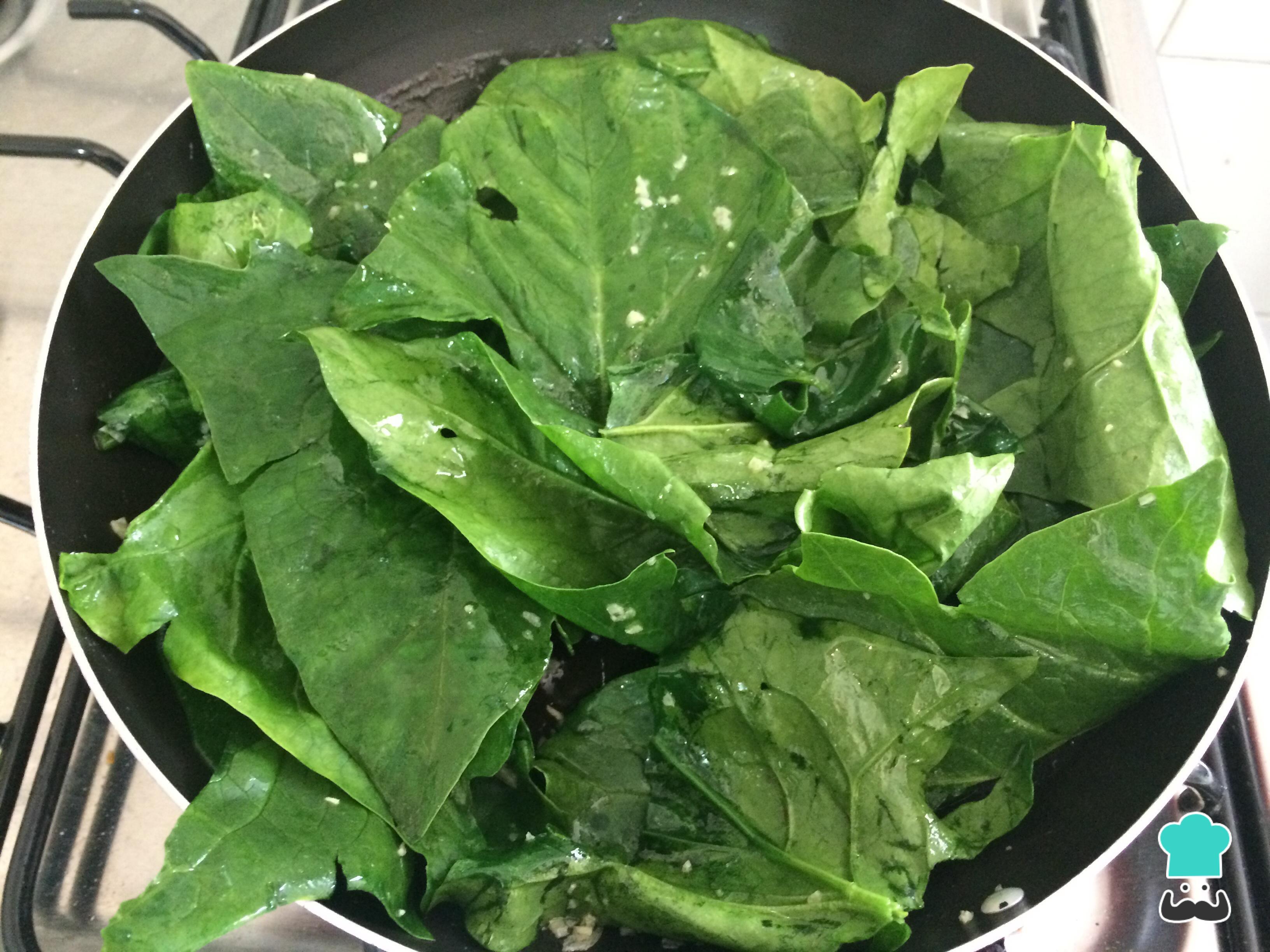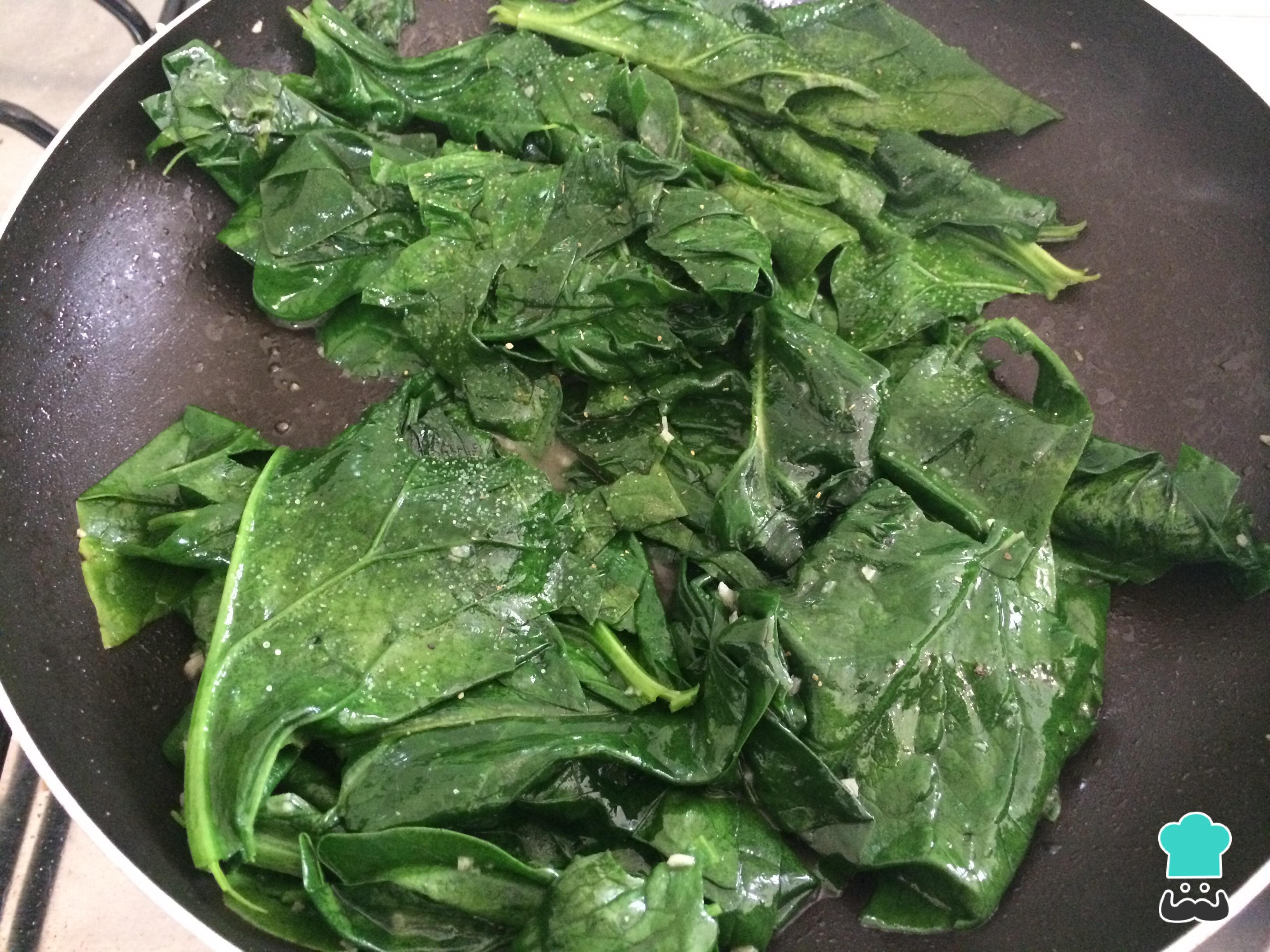 Lave e corte com as mãos as folhas de espinafre. Adicione-as à frigideira e cozinhe até que reduzam de tamanho.