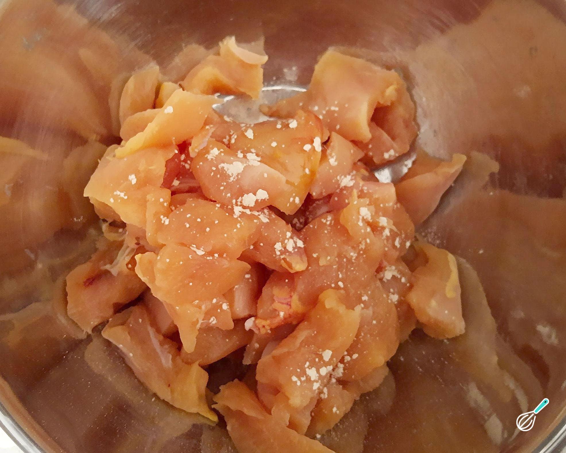 Para preparar esta receita de frango cremoso comece por cortar o frango em pedacinhos. Coloque numa tigela e tempere com o sal e o alho amassado ou picado finamente.