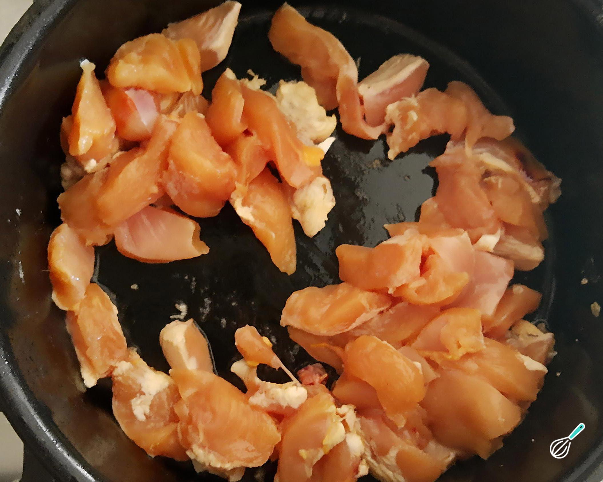 Leve ao fogo uma panela ou frigideira funda com o azeite e espere esquentar. Adicione o frango e deixe cozinhar, mexendo de vez em quando, até mudar de cor.