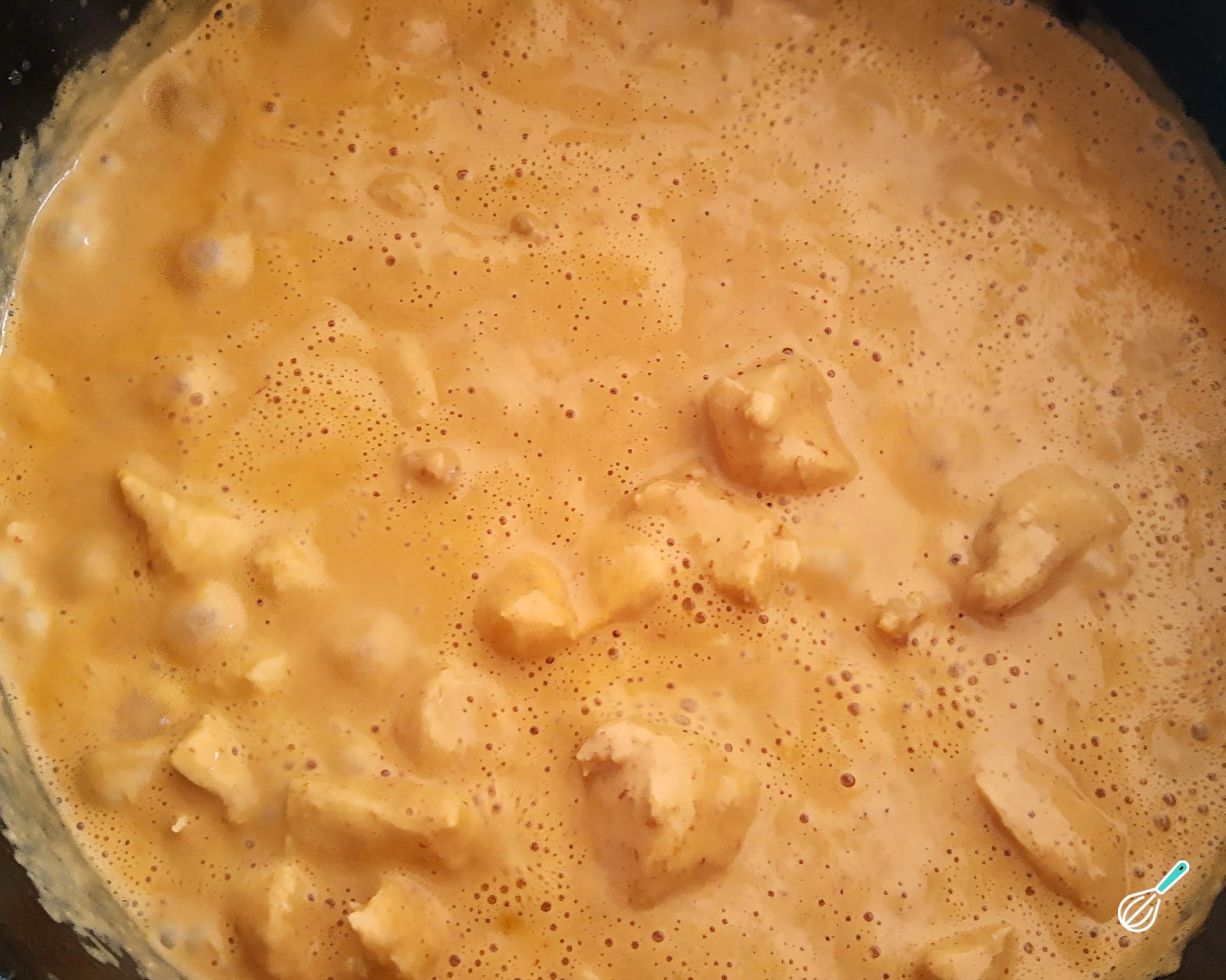 Quando o frango estiver levemente dourado, adicione a mistura do liquidificador e mexa. Deixe cozinhar por mais 5-10 minutos, mexendo constantemente para evitar queimar ou grudar no fundo.