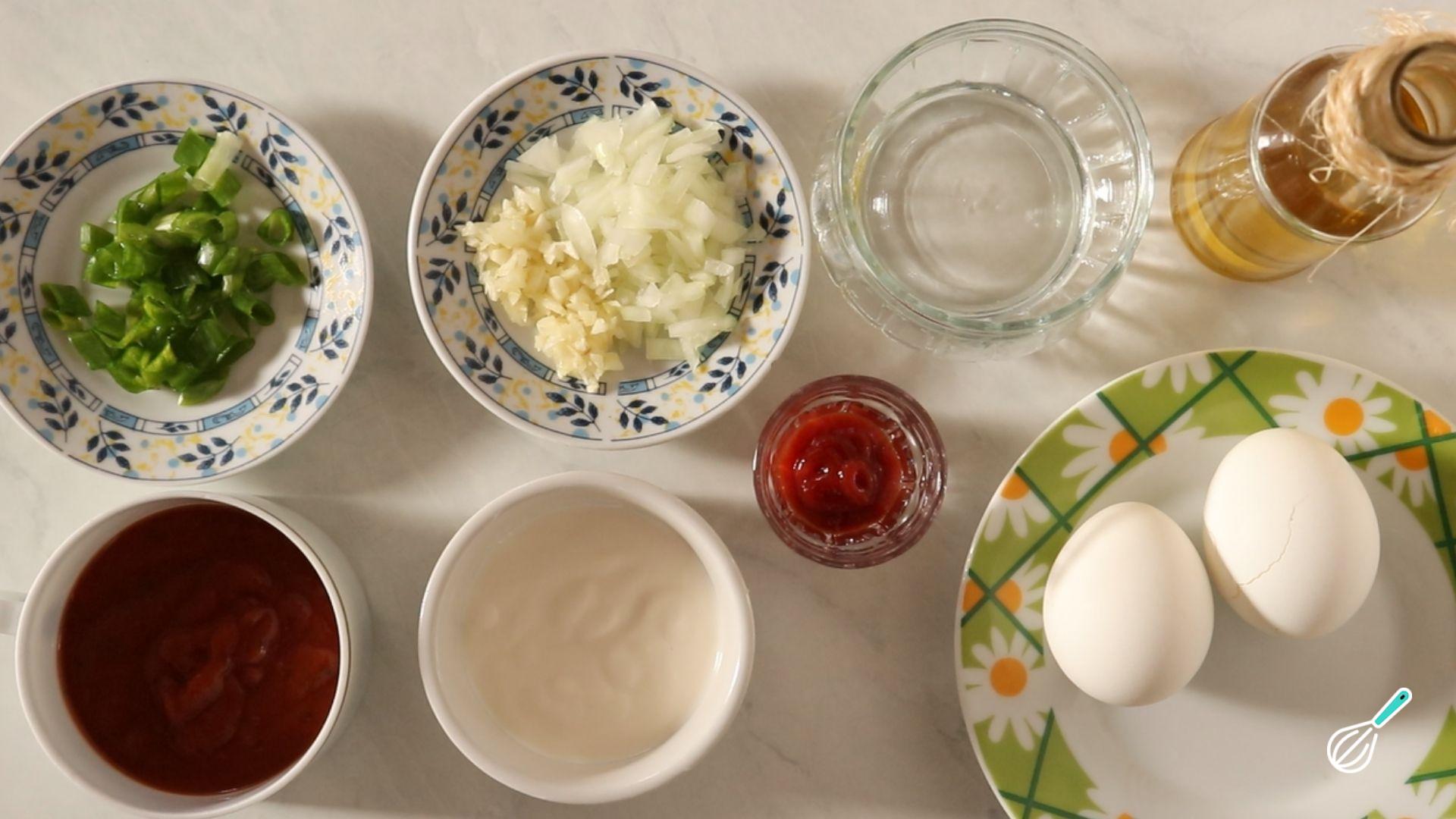 Comece separando os ingredientes do seu estrogonofe de ovo. Pique o alho, a cebola e a cebolinha.