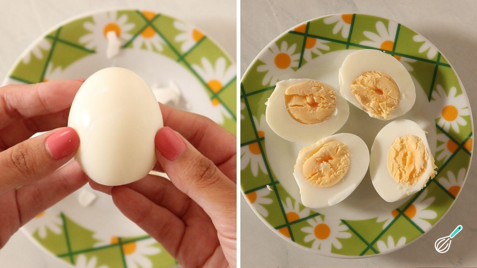 Cozinhe os ovos por 10 minutos a partir do momento que a água ferver. Descasque delicadamente, corte ao meio e reserve.