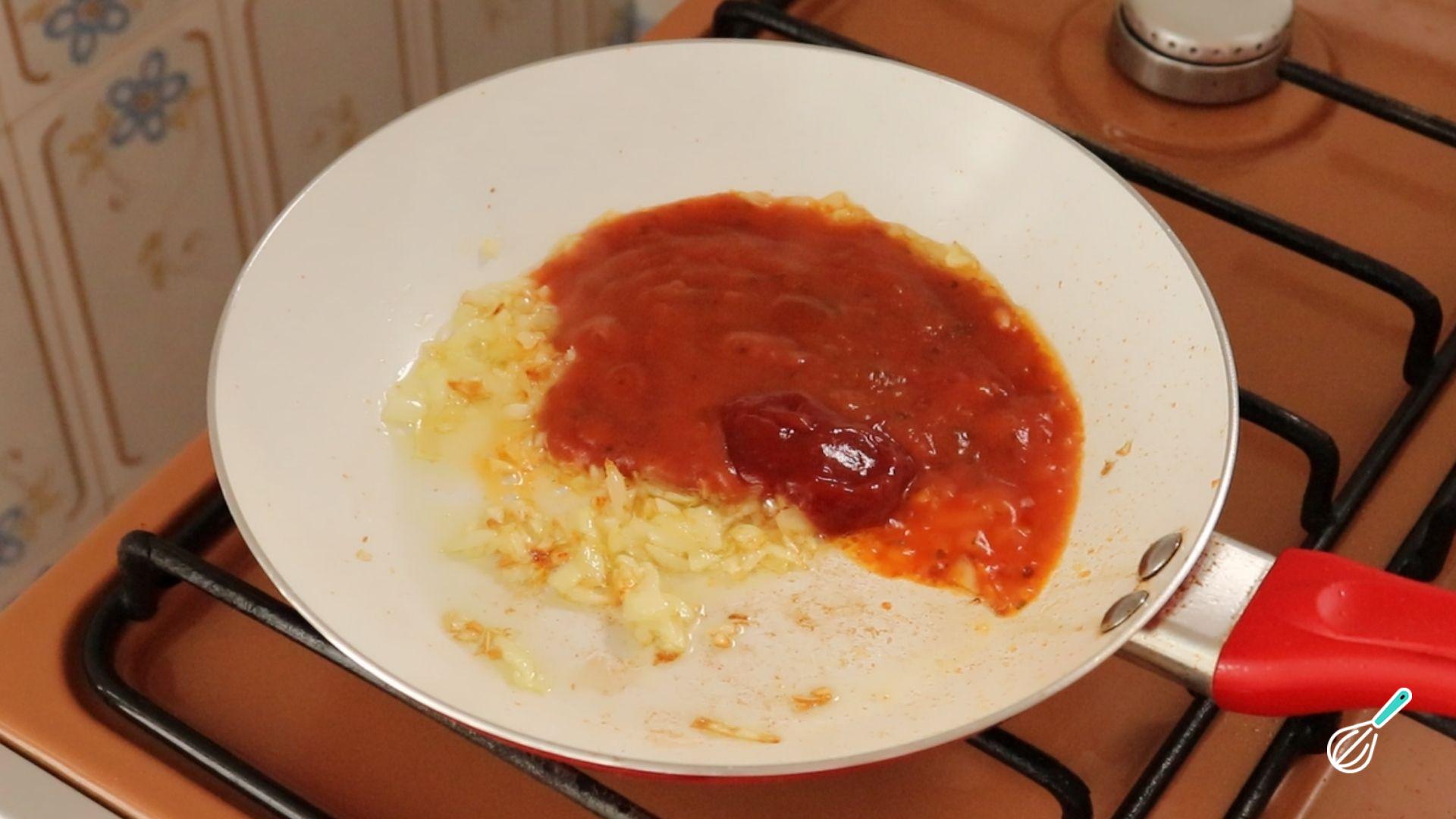 Quando dourar, despeje o molho de tomate, o ketchup e misture bem. Em seguida adicione a água e misture mais uma vez.